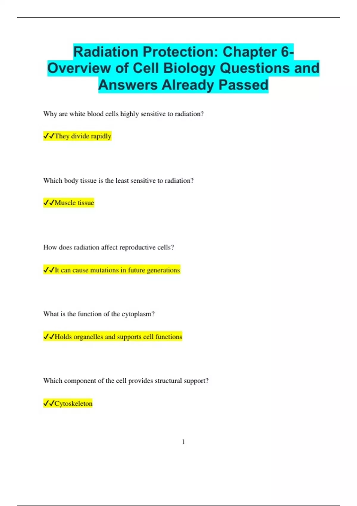 Radiation Protection: Chapter 6- Overview of Cell Biology Questions and Answers Already Passed Why are white blood cells highly sensitive to radiation? They divide rapidly Which body tissue is the least sensitive to radiation? Muscle tissue How does radiation affect reproductive cells? It can cause mutations in future generations What is the function of the cytoplasm? Holds organelles and supports cell functions Which component of the cell provides structural support? Cytoskeleton 2 What happens if radiation causes excessive damage to cellular proteins? The cell may lose function or die What is the main goal of radiation protection? To minimize radiation exposure and its harmful effects What part of the cell contains the genetic material that directs cell functions? Nucleus What is the function of mitochondria in a cell? Produce energy Which macromolecule is responsible for storing genetic information? DNA What is the most radiation-sensitive part of a cell? DNA 3 Which type of cell division occurs in somatic cells? Mitosis What is the function of ribosomes in a cell? Protein synthesis Which cells in the human body are the most sensitive to radiation? Stem cells What happens to a cell when radiation damages its DNA? It may die, repair itself, or mutate Which phase of the cell cycle is the most sensitive to radiation? M phase What is apoptosis? Programmed cell death 4 What happens when a cell cannot repair radiation-induced damage? It may die or become cancerous