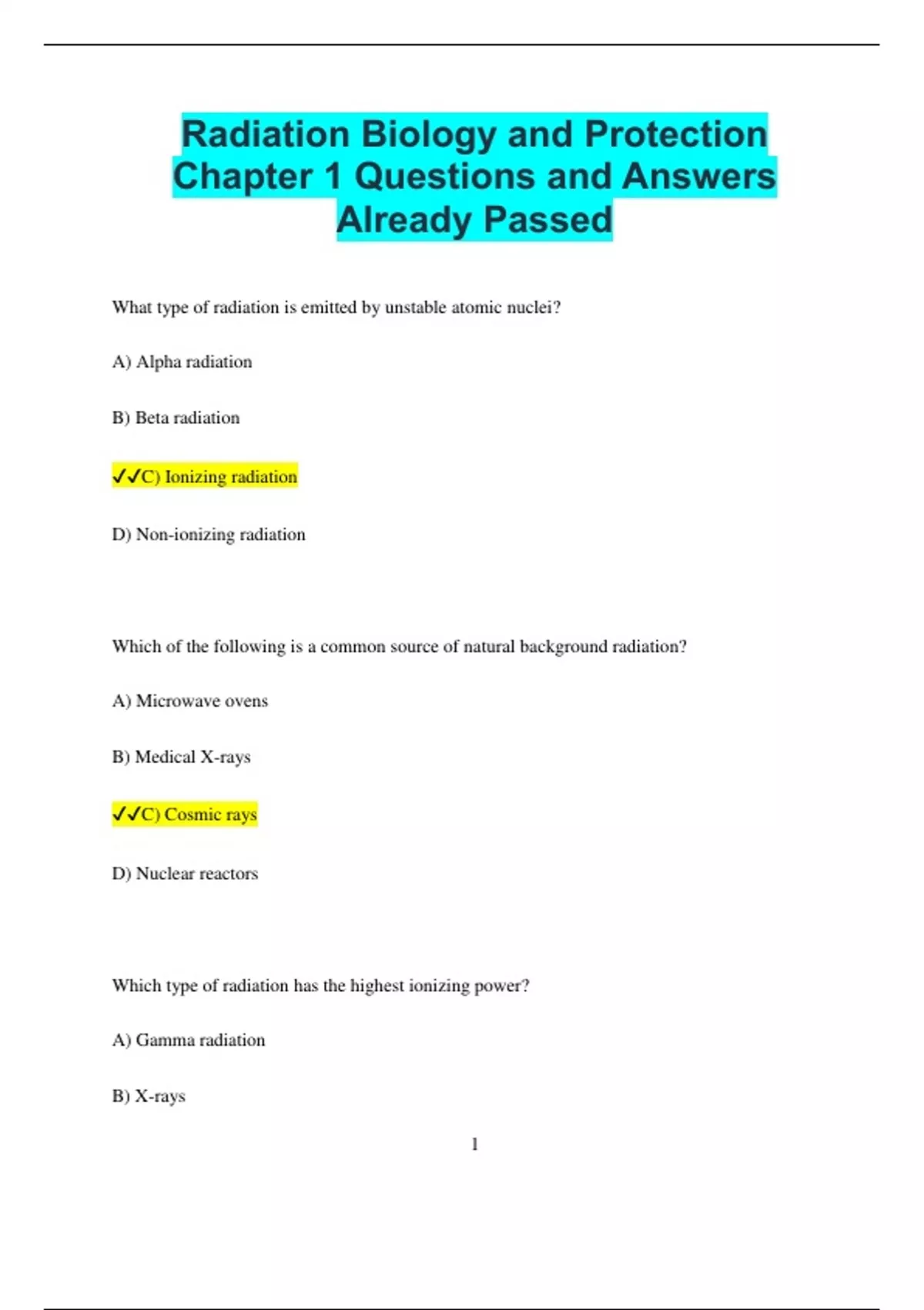 Radiation Biology and Protection Chapter 1 Questions and Answers Already Passed What type of radiation is emitted by unstable atomic nuclei? A) Alpha radiation B) Beta radiation C) Ionizing radiation D) Non-ionizing radiation Which of the following is a common source of natural background radiation? A) Microwave ovens B) Medical X-rays C) Cosmic rays D) Nuclear reactors Which type of radiation has the highest ionizing power? A) Gamma radiation B) X-rays 2 C) Alpha radiation D) Neutron radiation What is the unit used to measure absorbed radiation dose? A) Roentgen B) Gray C) Sievert D) Curie Which of the following materials is most commonly used as a radiation shield? A) Lead B) Concrete C) Aluminum D) Copper What does the term "ALARA" stand for in radiation protection? A) As Low As Reasonably Achievable B) As Long As Radiation Allows Results 3 C) A Limit to Avoid Radiation Accumulation D) As Low As Radiation Allows Which organization is responsible for setting safety standards for radiation exposure? A) NASA B) FDA C) NRC (Nuclear Regulatory Commission) D) CDC Which type of radiation has the lowest penetration ability? A) Alpha radiation B) Beta radiation C) X-rays D) Gamma radiation What is the primary purpose of the radiation protection principle of time, distance, and shielding? A) To increase radiation exposure 4 B) To reduce exposure to radiation