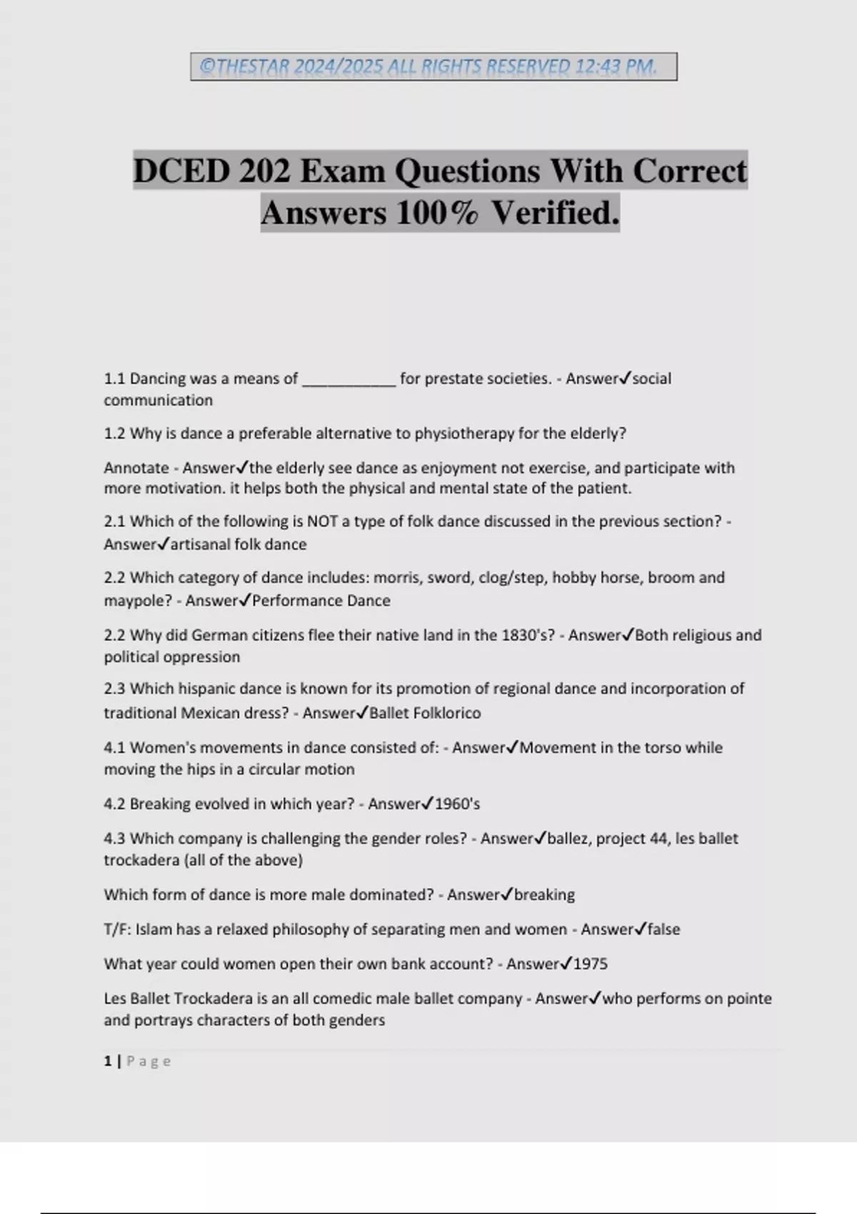 ©THESTAR 2024/2025 ALL RIGHTS RESERVED 12:43 PM. 1 | P a g e DCED 202 Exam Questions With Correct Answers 100% Verified. 1.1 Dancing was a means of ___________ for prestate societies. - Answersocial communication 1.2 Why is dance a preferable alternative to physiotherapy for the elderly? Annotate - Answerthe elderly see dance as enjoyment not exercise, and participate with more motivation. it helps both the physical and mental state of the patient. 2.1 Which of the following is NOT a type of folk dance discussed in the previous section? - Answerartisanal folk dance 2.2 Which category of dance includes: morris, sword, clog/step, hobby horse, broom and maypole? - AnswerPerformance Dance 2.2 Why did German citizens flee their native land in the 1830's? - AnswerBoth religious and political oppression 2.3 Which hispanic dance is known for its promotion of regional dance and incorporation of traditional Mexican dress? - AnswerBallet Folklorico 4.1 Women's movements in dance consisted of: - AnswerMovement in the torso while moving the hips in a circular motion 4.2 Breaking evolved in which year? - Answer1960's 4.3 Which company is challenging the gender roles? - Answerballez, project 44, les ballet trockadera (all of the above) Which form of dance is more male dominated? - Answerbreaking T/F: Islam has a relaxed philosophy of separating men and women - Answerfalse What year could women open their own bank account? - Answer1975 Les Ballet Trockadera is an all comedic male ballet company - Answerwho performs on pointe and portrays characters of both genders ©THESTAR 2024/2025 ALL RIGHTS RESERVED 12:43 PM. 2 | P a g e Liquid Lead is a term used most commonly in - Answerballroom dancing T/F: Stonewall was a historical event that changed women's gender role in society - AnswerFalse T/F: Religion played a large role in the interaction between male and female dictating how they would behave together in a dance. - AnswerTrue What are true about women dancing in traditional dance forms? - Answermovements consisted of shimmy torso and circular hip movements (B) and showed flexibility, grace and emotion (D) What are true about men dancing in traditional dance forms? - Answerall of the above. leaps and jumps, public dance other men. swords/instruments of war. lower upper strength. T/F: A man traditionally leads a woman in couple dancing such as ballroom and two-stepping. - Answertrue 5.1 Which ballet is regarded as the epitome of Romantic Ballet? - AnswerGiselle 5.2 The shows put on by the Ballet Russes and Diaghilev are known to be _____. - Answerentertaining and theatrical 5.3 What distinguishes contemporary from neoclassical ballet? - Answerthe use of storyline, plots, and acting 5.4 T/F: Ballerinas today are expected to perform a variety of styles including romantic, classical, and contemporary works. - Answertrue 7.1 Which academic category is danced considered a part of? - Answerphysical education and arts 7.2 Tap dance is an example of what category of dance? - Answerconcert/performance dance 7.3 The first drill team, created by Gussie Nell Davis, was known as ___________. - Answerthe flaming flashes 7.4 T/F: Scientific studies have shown that the arts help to turn schools into communities - Answertrue 8.1 Jazz and Tap are a fusion of what two groups of cultural and dance elements? - AnswerEuropean and African 8.2 Why was the advancement of tap dance technique more successful on Vaudeville than on Broadway? - Answervaudeville dancers performed in smaller groups allowing for the creation of more complex rhyth
