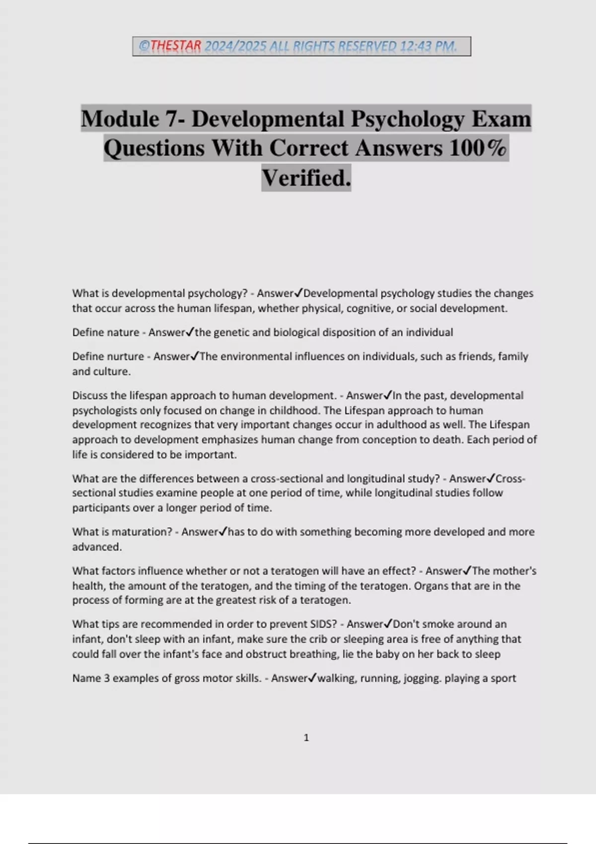 ©THESTAR 2024/2025 ALL RIGHTS RESERVED 12:43 PM. 1 Module 7- Developmental Psychology Exam Questions With Correct Answers 100% Verified. What is developmental psychology? - AnswerDevelopmental psychology studies the changes that occur across the human lifespan, whether physical, cognitive, or social development. Define nature - Answerthe genetic and biological disposition of an individual Define nurture - AnswerThe environmental influences on individuals, such as friends, family and culture. Discuss the lifespan approach to human development. - AnswerIn the past, developmental psychologists only focused on change in childhood. The Lifespan approach to human development recognizes that very important changes occur in adulthood as well. The Lifespan approach to development emphasizes human change from conception to death. Each period of life is considered to be important. What are the differences between a cross-sectional and longitudinal study? - AnswerCross- sectional studies examine people at one period of time, while longitudinal studies follow participants over a longer period of time. What is maturation? - Answerhas to do with something becoming more developed and more advanced. What factors influence whether or not a teratogen will have an effect? - AnswerThe mother's health, the amount of the teratogen, and the timing of the teratogen. Organs that are in the process of forming are at the greatest risk of a teratogen. What tips are recommended in order to prevent SIDS? - AnswerDon't smoke around an infant, don't sleep with an infant, make sure the crib or sleeping area is free of anything that could fall over the infant's face and obstruct breathing, lie the baby on her back to sleep Name 3 examples of gross motor skills. - Answerwalking, running, jogging. playing a sport ©THESTAR 2024/2025 ALL RIGHTS RESERVED 12:43 PM. 2 Which hormone is produced by the hypothalamus and triggers the release of gonadotropins? - AnswerGnRH What is menopause? - AnswerA woman going 12 months without menstruation. How did Jean Piaget come up with his theory of cognitive development? - AnswerBy observing his children as they grew up as well as other children. Describe the sensorimotor stage - AnswerFrom birth to age 2, according to Piaget. In this stage, infants learn about the world by interacting with it—by touching and tasting. Infants must physically interact with something in order to think about it. Infants in this stage do not understand object permanence. What is object permanence? - AnswerThe idea that objects still exist even if you can't see them. What mental task do preoperational children have trouble with? - AnswerConservation. They cannot conserve substances, or they don't understand that the physical properties of substances or subjects do not change if nothing is added or taken away What are the differences between concrete operational thought and formal operational thought? - AnswerConcrete Operational thought is logical and sequential. Conservation. Formal Operational thought is even beyond simple logic and includes scientific and abstract reasoning. What is overregularization? - AnswerOver-applying a grammar rule. What is your reaction to the results from the Seattle Longitudinal Study? Be specific. - AnswerI am not surprised that the middle-aged adults outperformed their younger selves. We learn every day and with age comes knowledge and experience. What is a crisis, according to Erikson? - AnswerA moment of decision Describe the Trust vs. Mistrust stage. - AnswerIf infants have loving caregivers who supply safety and security for the infant, the baby will develop a sense of trust in them. If, however, the infant's life is chaotic and lacks reliable caregivers, the infant may develop a mistrustful outlook toward people. What are some of the main issues in Erikson's childhood stages? - AnswerAutonomy vs. Self Doubt: children recognizing that they are separate from their parents. Initiative vs. Guilt: children understanding that they have the ability to make and create things. Competence vs. Inferiority: children re