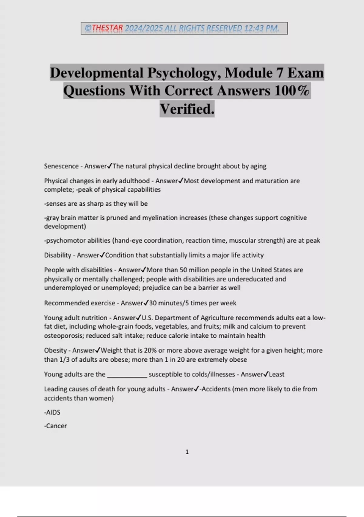 ©THESTAR 2024/2025 ALL RIGHTS RESERVED 12:43 PM. 1 Developmental Psychology, Module 7 Exam Questions With Correct Answers 100% Verified. Senescence - AnswerThe natural physical decline brought about by aging Physical changes in early adulthood - AnswerMost development and maturation are complete; -peak of physical capabilities -senses are as sharp as they will be -gray brain matter is pruned and myelination increases (these changes support cognitive development) -psychomotor abilities (hand-eye coordination, reaction time, muscular strength) are at peak Disability - AnswerCondition that substantially limits a major life activity People with disabilities - AnswerMore than 50 million people in the United States are physically or mentally challenged; people with disabilities are undereducated and underemployed or unemployed; prejudice can be a barrier as well Recommended exercise - Answer30 minutes/5 times per week Young adult nutrition - AnswerU.S. Department of Agriculture recommends adults eat a low- fat diet, including whole-grain foods, vegetables, and fruits; milk and calcium to prevent osteoporosis; reduced salt intake; reduce calorie intake to maintain health Obesity - AnswerWeight that is 20% or more above average weight for a given height; more than 1/3 of adults are obese; more than 1 in 20 are extremely obese Young adults are the ___________ susceptible to colds/illnesses - AnswerLeast Leading causes of death for young adults - Answer-Accidents (men more likely to die from accidents than women) -AIDS -Cancer ©THESTAR 2024/2025 ALL RIGHTS RESERVED 12:43 PM. 2 -Heart Disease -Suicide African Americans have ________ the death rate of Caucasians - AnswerTwice At the age of __________, illness and disease overtake accidents as the leading cause of death - Answer45 Stress - AnswerThe physical and emotional response to events that threaten or challenge us Psychoneuroimmunology - AnswerThe study of the relationship among the brain, the immune system, and psychological factors Stressors - AnswerStressors can be both pleasant events and unpleasant events; stress produces several outcomes that impact health - long-term, continuous exposure to stressors results in a reduction of the body dealing with stress Primary appraisal - AnswerThe assessment of an event to determine whether its implications are positive, negative, or neutral Secondary appraisal - AnswerThe assessment of whether one's coping abilities and resources are adequate to overcome the threat or challenge posed by the potential stressor Events that cause stress - AnswerEvents that bring on negative emotions; unexpected or uncontrollable situations; ambiguous or confusing events; having to accomplish too many tasks at once Consequences of stress - AnswerHeadaches, backaches, skin rashes, indigestion, chronic fatigue, colds, immune system issues Coping - AnswerThe effort to control, reduce, or learn to tolerate the threats that lead to stress Types of coping - AnswerGood: Problem-focused coping - change situation Emotion-focused coping - regulate emotions, get social support Bad: Defensive coping - unconscious strategies distort or deny the situation (avoiding or escaping - drinking, denial, binging, etc.) Emotional insulation - blocking emotions Piaget believed... - AnswerVery few cognitive changes occur in young adulthood, but research indicates he was wrong