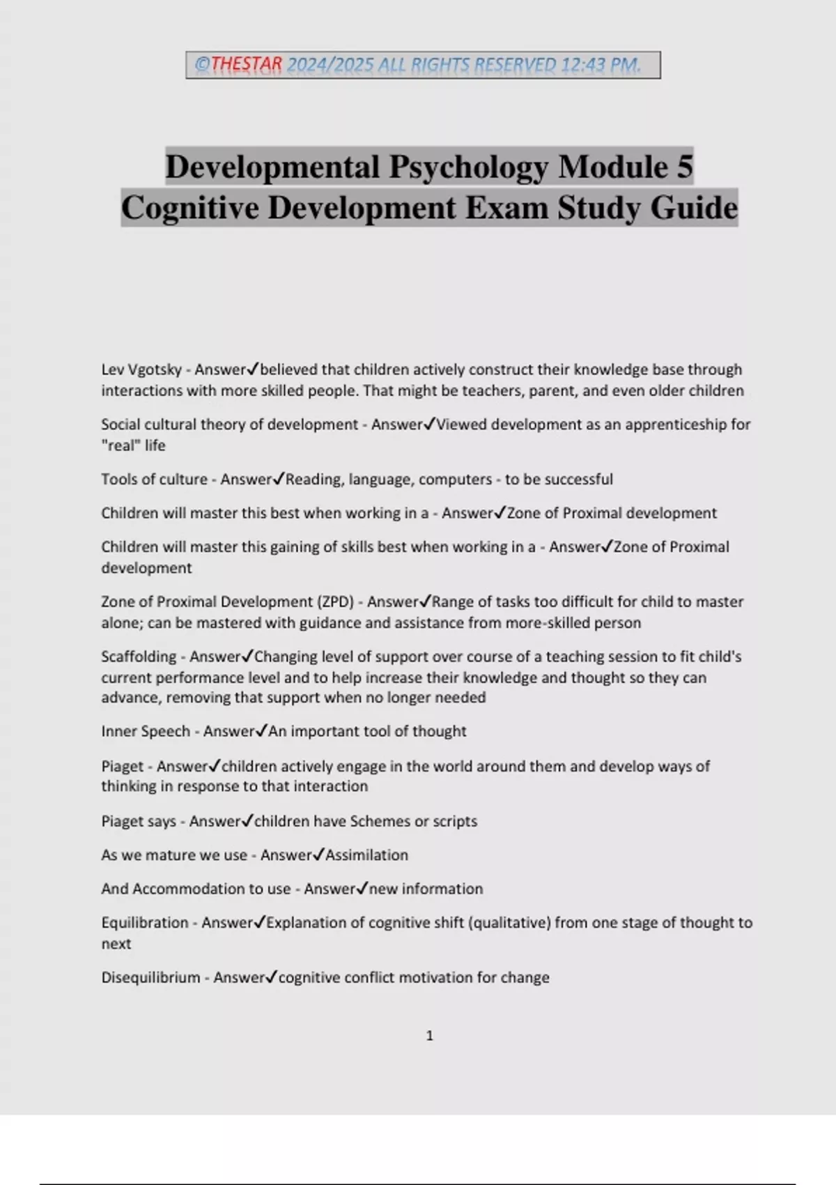 ©THESTAR 2024/2025 ALL RIGHTS RESERVED 12:43 PM. 1 Developmental Psychology Module 5 Cognitive Development Exam Study Guide Lev Vgotsky - Answerbelieved that children actively construct their knowledge base through interactions with more skilled people. That might be teachers, parent, and even older children Social cultural theory of development - AnswerViewed development as an apprenticeship for "real" life Tools of culture - AnswerReading, language, computers - to be successful Children will master this best when working in a - AnswerZone of Proximal development Children will master this gaining of skills best when working in a - AnswerZone of Proximal development Zone of Proximal Development (ZPD) - AnswerRange of tasks too difficult for child to master alone; can be mastered with guidance and assistance from more-skilled person Scaffolding - AnswerChanging level of support over course of a teaching session to fit child's current performance level and to help increase their knowledge and thought so they can advance, removing that support when no longer needed Inner Speech - AnswerAn important tool of thought Piaget - Answerchildren actively engage in the world around them and develop ways of thinking in response to that inte