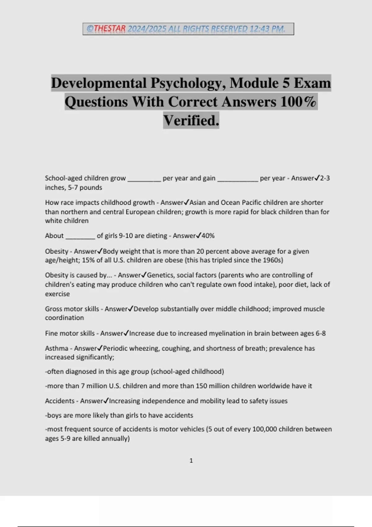 Gross motor skills - Answer✔Develop substantially over middle childhood; improved muscle