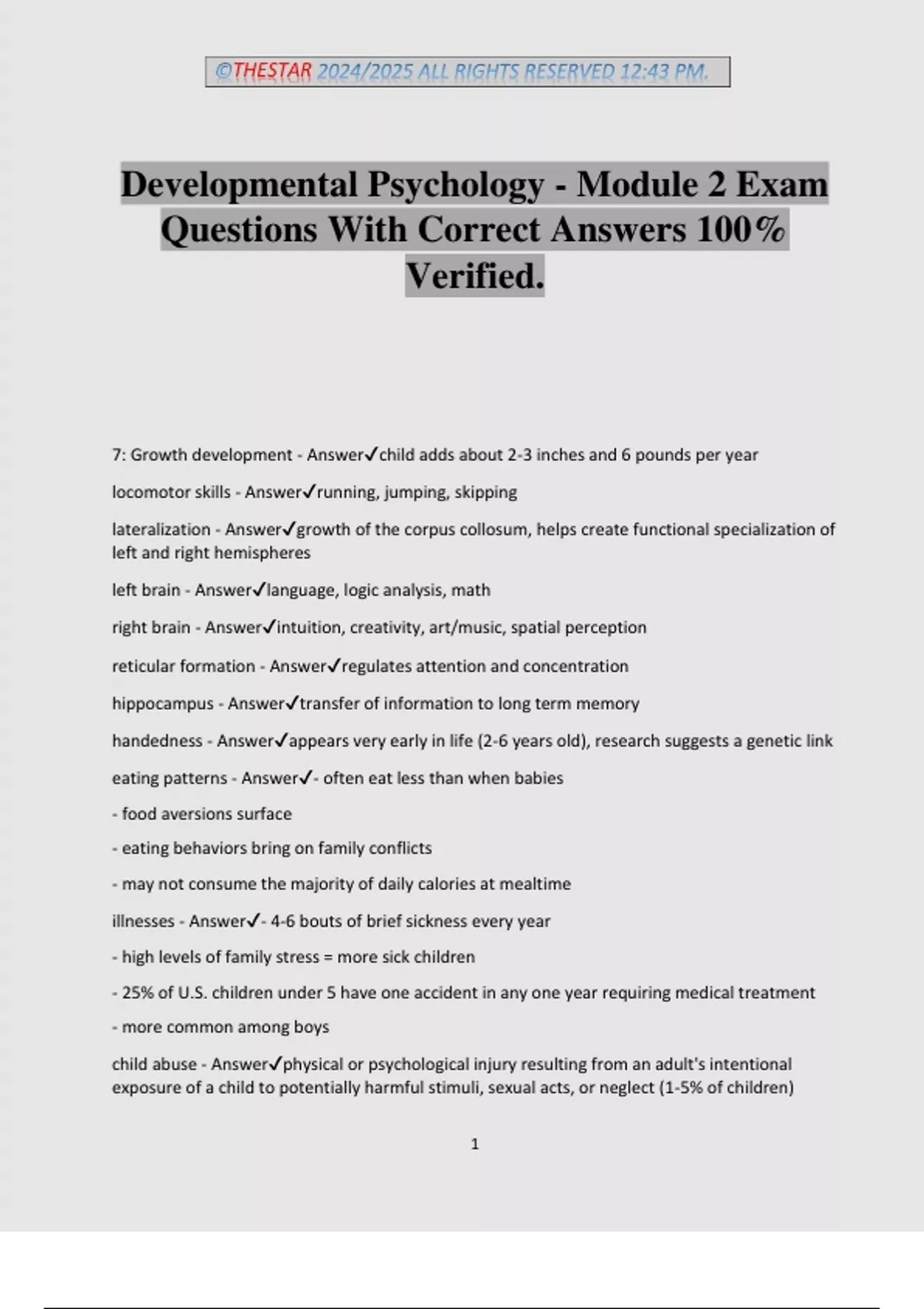 ©THESTAR 2024/2025 ALL RIGHTS RESERVED 12:43 PM. 1 Developmental Psychology - Module 2 Exam Questions With Correct Answers 100% Verified. 7: Growth development - Answerchild adds about 2-3 inches and 6 pounds per year locomotor skills - Answerrunning, jumping, skipping lateralization - Answergrowth of the corpus collosum, helps create functional specialization of left and right hemispheres left brain - Answerlanguage, logic analysis, math right brain - Answerintuition, creativity, art/music, spatial perception reticular formation - Answerregulates attention and concentration hippocampus - Answertransfer of information to long term memory handedness - Answerappears very early in life (2-6 years old), research suggests a genetic link eating patterns - Answer- often eat less than when babies - food aversions surface - eating behaviors bring on family conflicts - may not consume the majority of daily calories at mealtime illnesses - Answer- 4-6 bouts of brief sickness every year - high levels of family stress = more sick children - 25% of U.S. children under 5 have one accident in any one year requiring medical treatment - more common among boys child abuse - Answerphysical or psychological injury resulting from an adult's intentional exposure of a child to potentially harmful stimuli, sexual acts, or neglect (1-5% of children) ©THESTAR 2024/2025 ALL RIGHTS RESERVED 12:43 PM. 2 socio-cultural factors of child abuse - Answerpersonal or cultural values that regard physical abuse as morally acceptable characteristics of the child of child abuse - Answerphysical/mental disabilities, difficult temperaments characteristics of the abuser of child - Answerdepressed, lacking in parenting skills and knowledge, history of abuse themselves, substance abusers family stress of child abusers - Answerpoverty, unemployment, inter parental conflicts consequence of abuse - Answer- PTSD - delays in all domains of development - children removed from abusive situation appear to catch up prevention of abuse - Answereducate parents!! Piaget's Preoperational stage - Answer- increased proficiency in the use symbols - still have difficulty thinking logically centration - Answerchild tendency to think of the word in terms of one variable at a time egocentrism - Answertendency to look at things from his or her own perspective Piaget three-mountain task - Answerhow mountains look to the doll across the table animism - Answerthe belief that inanimate objects are alive irreversibility - Answerthe inability to mentally reverse actions or ideas conservation - Answerthe understanding that matter can change appearance without changing in quality (inability) challenge to Piaget's views - Answerchildren as young as 2-3 seem to have at least some ability to understand that another person sees things or experiences things differently than they do Flavell's perspective-taking ability - Answer- Level one -> child knows that other people experience things differently (2-3 years old) - Level two -> child develops a series of complex rules to figure out precisely what the other person sees or experiences (4-5 years) Theories of mind - Answer- 18 months -> rudimentary beginnings - Age 3 -> some aspects of link between people's thinking, feelings, and behavior ©THESTAR 2024/2025 ALL RIGHTS RESERVED 12:43 PM. 3 - Age 4 -> basic principle that each person's actions are based on their representation of reality - 4-5 year olds -> can't understand that other can think about them or most knowledge can be derived from inference - 5-7 -> understand reciprocal natural of thought False belief principle - Answerchildren can look at a problem from another's POV and discern what information causes a person to believe something that isn't true Influences on Development of a Theory of Mind - Answer- Correlated with performance on Piaget's tasks - Pretend play - Shared pretense with other children - Discussion of emotion-provoking events with parents - Language skills - Some research suggests cross-cultural replication Neo-Piagetian Theories: Robbie case - Answer- short-term storage space (STTS) - operational efficiency - matrix classification short-term storage space (STTS) - Answerrefers to child's working memory operational efficiency - Answerlimited number of schemes to which a child can attend, improves through practice and brain maturation matrix classification - Answerrequires a child to place a given stimulus in two categories simultaneously Information Processing Theories - Answermetamemory & metacognition metamemory - Answerknowledge about and control of memory processes (2-6 poor memory) metacognition - Answerknowledge about and control of thought processes (enables chid to generate strategies to solve problems) Stages of Cognitive Developmen