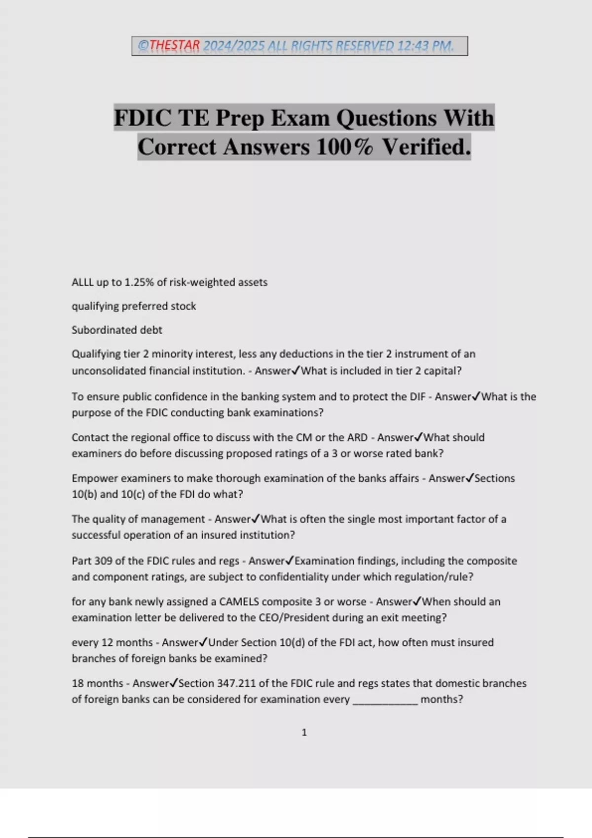 ©THESTAR 2024/2025 ALL RIGHTS RESERVED 12:43 PM. 1 FDIC TE Prep Exam Questions With Correct Answers 100% Verified. ALLL up to 1.25% of risk-weighted assets qualifying preferred stock Subordinated debt Qualifying tier 2 minority interest, less any deductions in the tier 2 instrument of an unconsolidated financial institution. - AnswerWhat is included in tier 2 capital? To ensure public confidence in the banking system and to protect the DIF - AnswerWhat is the purpose of the FDIC conducting bank examinations? Contact the regional office to discuss with the CM or the ARD - AnswerWhat should examiners do before discussing proposed ratings of a 3 or worse rated bank? Empower examiners to make thorough examination of the banks affairs - AnswerSections 10(b) and 10(c) of the FDI do what? The quality of management - AnswerWhat is often the single most important factor of a successful operation of an insured institution? Part 309 of the FDIC rules and regs - AnswerExamination findings, including the composite and component ratings, are subject to confidentiality under which regulation/rule? for any bank newly assigned a CAMELS composite 3 or worse - AnswerWhen should an examination letter be delivered to the CEO/President during an exit meeting? every 12 months - AnswerUnder Section 10(d) of the FDI act, how often must insured branches of foreign banks be examined? 18 months - AnswerSection 347.211 of the FDIC rule and regs states that domestic branches of foreign banks can be considered for examination every ___________ months? ©THESTAR 2024/2025 ALL RIGHTS RESERVED 12:43 PM. 2 6 months - AnswerLimited scope examinations should be performed how many months after an enforcement action is issued? ~the bank has total assets of $3 billion or less ~ the bank is well capitalized as defined in 323.403(B)(1) of FDIC rules and regs ~the ban was assigned a management rating of 1 or 2 at the last examination ~the ban was assigned a composite rating of 1 or 2 at the last exam ~the bank is not subject to formal enforcement proceedings or order by the FDIC, OCC< or FRB ~no person acquired control of the bank during the preceding 12 months in which the last full- scope examination was completed - AnswerWhen can examination schedules be extended to 18 months for a state nonmember bank? The FFEIC to issue guidelines establishing standards for the purpose of determining the acceptability of state reports of examination. - AnswerSection 10(D)(9) ofthe FDI act requires what? 2 weeks - AnswerHow much times notice should a bank be given for notice of an up coming examination and provided enough time to complete pre-examination request With the FDIC absorbing 80% of injured losses (up to a stated threshold) and receives 80 percent of recoveries - AnswerHow are shared-loss agreements generally written? 5 years for losses and 8 years for recoveries - AnswerHow many years are commercial, shared loss agreements generally cover how many years for losses and recoveries? 10 years for both - AnswerFor residential mortgages, shared losses agreements generally cover how many years for losses and recoveries? The assets should be adversely classified (sub, doubt, loss) and be reduced by the applicable coverage rate stated in the SLA (often 80% or 95%) - AnswerHow should an asset covered under a shared loss agreement be classified? All deficiencies and supervisory recommendations that will be cited in the ROE. - AnswerDuring an exit meeting, management should be made aware of what? ~36 months or more have elapsed since the last such meeting ~the management component is 3 or worse ~two component ratings are 3 or worse ~or any other CAMEL rating is 4 or 5 - AnswerWhen is a board meeting required? ©THESTAR 2024/2025 ALL RIGHTS RESERVED 12:43 PM. 3 Uniform Interagency Trust Rating System; composites 1-5. - AnswerWhat system was devised to rate a Trust department and what composite ratings are established? ~management ~operations, internal controls, and audits ~earnings ~compliance ~asset management - AnswerWhat five critical areas are evaluated in a Trust exam? To determine confidentiality, integrity, and availability of records produced my automated systems - AnswerWhat is the primary purposed of an IT exam? The Uniform rating System for Information Technology (URIST) - AnswerIT operations are rated in accordance to? ~Management ~Audit ~Support and Delivery ~development and acquisition - AnswerWhat four areas are evaluated in an IT examination? To ensure U.S. financial institutions maintain appropriate records and file certain reports involving currency transactions and customers relations. - AnswerWhat is the purpose of a BSA examination? Section 501(b) of the Gramm-Leach-Bailey Act - AnswerExaminer information ,may contain non-public customer information defined by what? 1 examination cycle - AnswerHow long should line sheets be retained 10 years, indefinitely when irregularities are discovered or suspected. - AnswerHow long should risk management and trust questionnaires be retained? Composite 1 - AnswerFinancial institutions in this group are sound in every respect and generally have components rated 1 or 2. Any weaknesses are minor and can be handled in a routine manner by the board of directors and management. These financial institutions are the most capable of withstanding the vagaries of business conditions and are resistant to outside influences such as economic instability in their trade area. These financial institutions are in substantial compliance with laws and regulations. As a result, these financial institutions exhibit ©THESTAR 2024/2025 ALL RIGHTS RESERVED 12:43 PM. 4 the strongest performance and risk management practices relative to the institution's size, complexity, and risk profile, and give no cause for supervisory concern. Composite 2 - AnswerFinancial institutions in this group are fundamentally sound. For a financial institution to receive this rating, generally no component rating should be more sev