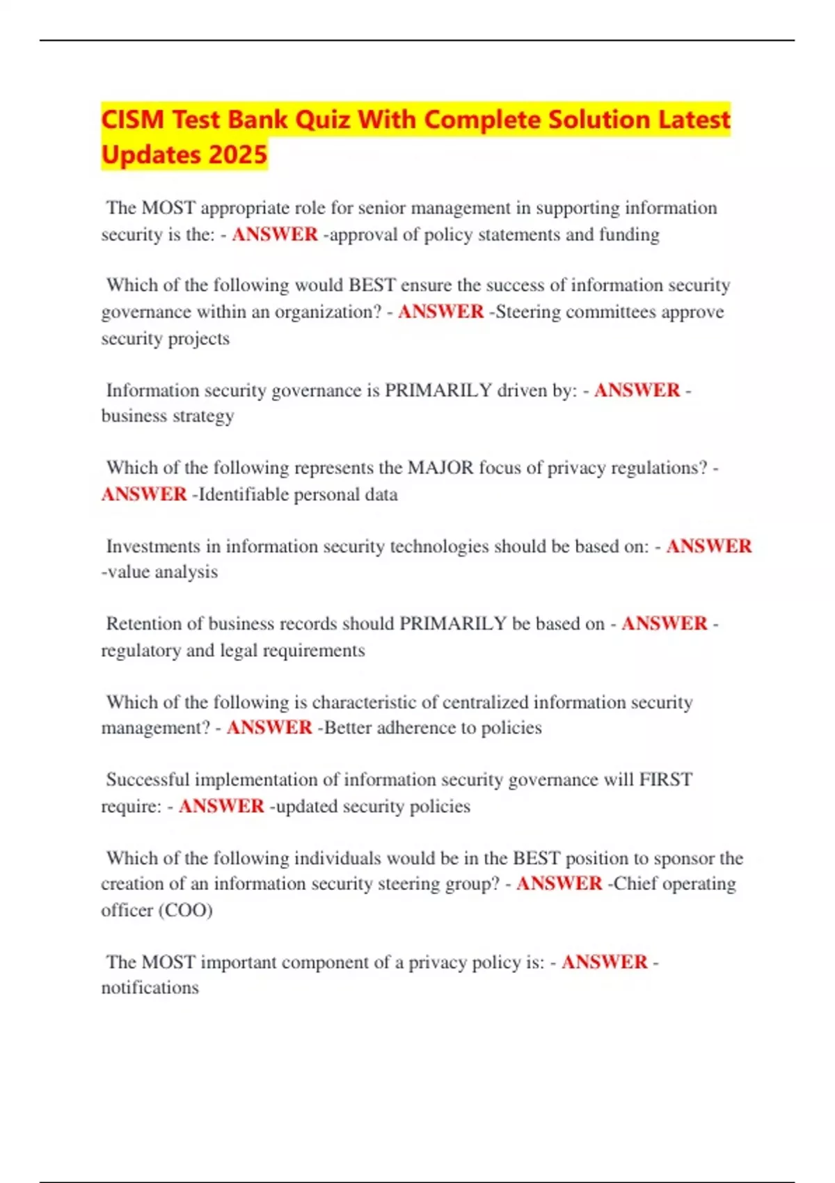 CISM Test Bank Quiz With Complete Solution Latest Updates 2025 The MOST appropriate role for senior management in supporting information security is the: - ANSWER -approval of policy statements and funding Which of the following would BEST ensure the success of information security governance within an organization? - ANSWER -Steering committees approve security projects Information security governance is PRIMARILY driven by: - ANSWER - business strategy Which of the following represents the MAJOR focus of privacy regulations? - ANSWER -Identifiable personal data Investments in information security technologies should be based on: - ANSWER -value analysis Retention of business records should PRIMARILY be based on - ANSWER - regulatory and legal requirements Which of the following is characteristic of centralized information security management? - ANSWER -Better adherence to policies Successful implementation of information security governance will FIRST require: - ANSWER -updated security policies Which of the following individuals would be in the BEST position to sponsor the creation of an information security steering group? - ANSWER -Chief operating officer (COO) The MOST important component of a privacy policy is: - ANSWER - notifications The cost of implementing a security control should not exceed the: - ANSWER - asset value When a security standard conflicts with a business objective, the situation should be resolved by: - ANSWER -performing a risk analysis Minimum standards for securing the technical infrastructure should be defined in a security: - ANSWER -architecture Which of the following is MOST appropriate for inclusion in an information security strategy? - ANSWER -Security processes, methods, tools and techniques Senior management commitment and support for information security will BEST be attained by an information security manager by emphasizing: - ANSWER - organizational risk Which of the following roles would represent a conflict of interest for an information security manager? - ANSWER -Final approval of information security policies Which of the following situations must be corrected FIRST to ensure successful information security governance within an organization? - ANSWER -The data center manager has final signoff on all security projects Which of the following requirements would have the lowest level of priority in information security? - ANSWER -Technical When an organization hires a new information security manager, which of the following goals should this individual pursue FIRST? - ANSWER -Establish good communication with steering committee members It is MOST important that information security architecture be aligned with which of the following? - ANSWER -Business goals and objectives Which of the following is MOST likely to be discretionary? - ANSWER - Guidelines Security technologies should be selected PRIMARILY on the basis of their: - ANSWER -ability to mitigate business risks Which of the following are seldom changed in response to technological changes? - ANSWER -Policies The MOST important factor in planning for the long-term retention of electronically stored business records is to take into account potential changes in: - ANSWER -application systems and media Which of the following is characteristic of decentralized information security management across a geographically dispersed organization? - ANSWER -Better alignment to business unit needs Which of the following is the MOST appropriate position to sponsor the design and implementation of a new security infrastructure in a large global enterprise? - ANSWER -Chief operating officer (COO) Which of the following would be the MOST important goal of an information security governance program? - ANSWER -Ensuring trust in data Relationships among security technologies are BEST defined through which of the following? - ANSWER -Security architecture A business unit intends to deploy a new technology in a manner that places it in violation of existing information security standards. What immediate action should an information security manager take? - ANSWER -Perform a risk analysis to quantify the risk Acceptable levels of information security risk should be determined by: - ANSWER -die steering committee