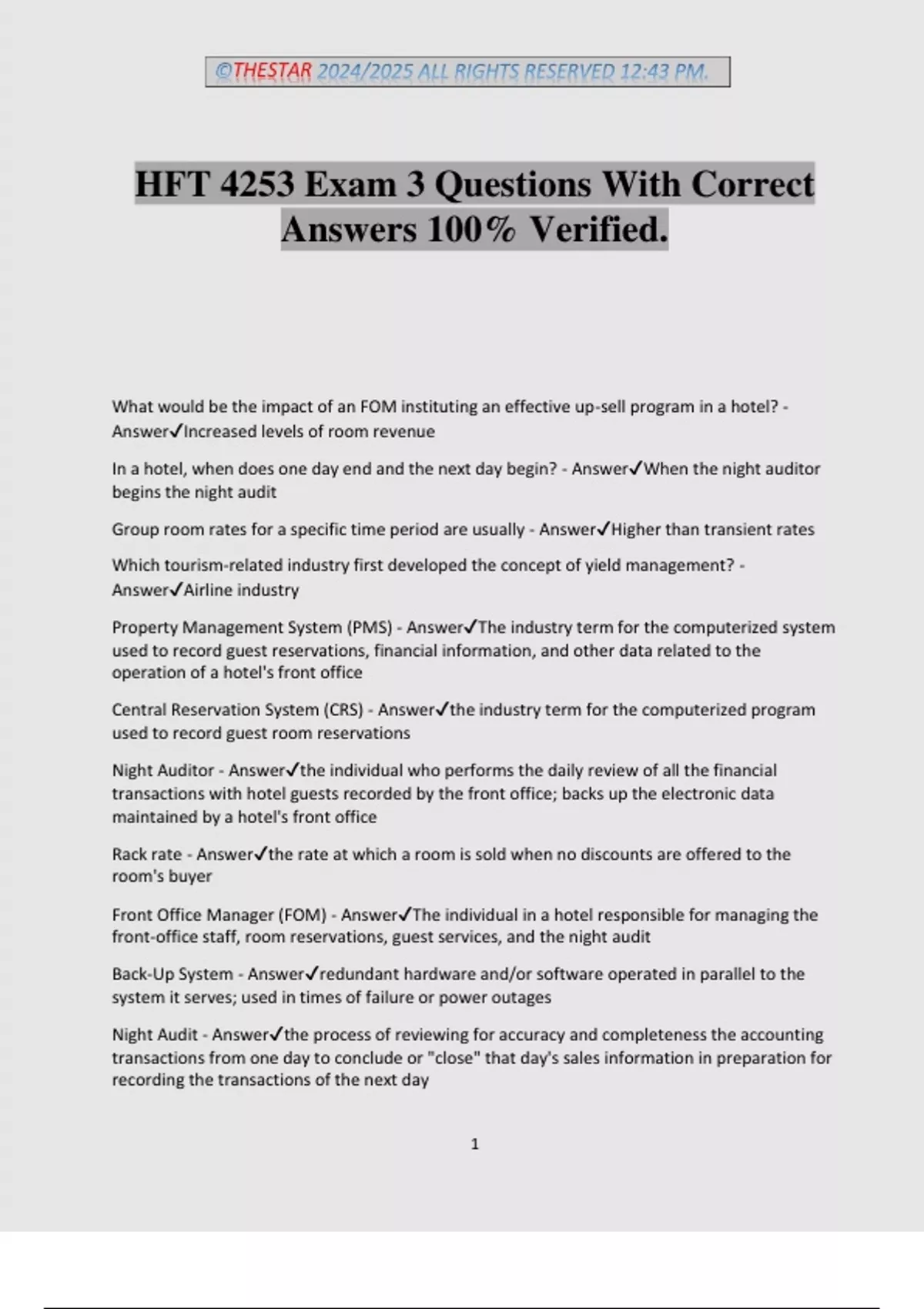 ©THESTAR 2024/2025 ALL RIGHTS RESERVED 12:43 PM. 1 HFT 4253 Exam 3 Questions With Correct Answers 100% Verified. What would be the impact of an FOM instituting an effective up-sell program in a hotel? - AnswerIncreased levels of room revenue In a hotel, when does one day end and the next day begin? - AnswerWhen the night auditor begins the night audit Group room rates for a specific time period are usually - AnswerHigher than transient rates Which tourism-related industry first developed the concept of yield management? - AnswerAirline industry Property Management System (PMS) - AnswerThe industry term for the computerized system used to record guest reservations, financial information, and other data related to the operation of a hotel's front office Central Reservation System (CRS) - Answerthe industry term for the computerized program used to record guest room reservations Night Auditor - Answerthe individual who performs the daily review of all the financial transactions with hotel guests recorded by the front office; backs up the electronic data maintained by a hotel's front office Rack rate - Answerthe rate at which a room is sold when no discounts are offered to the room's buyer Front Office Manager (FOM) - AnswerThe individual in a hotel responsible for managing the front-office staff, room reservations, guest services, and the night audit Back-Up System - Answerredundant hardware and/or software operated in parallel to the system it serves; used in times of failure or power outages Night Audit - Answerthe process of reviewing for accuracy and completeness the accounting transactions from one day to conclude or "close" that day's sales information in preparation for recording the transactions of the next da