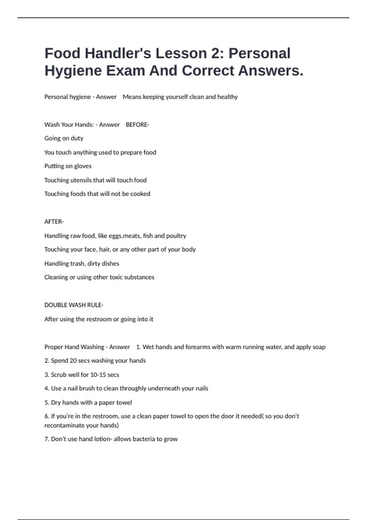 Food Handler's Lesson 2: Personal Hygiene Exam And Correct Answers.