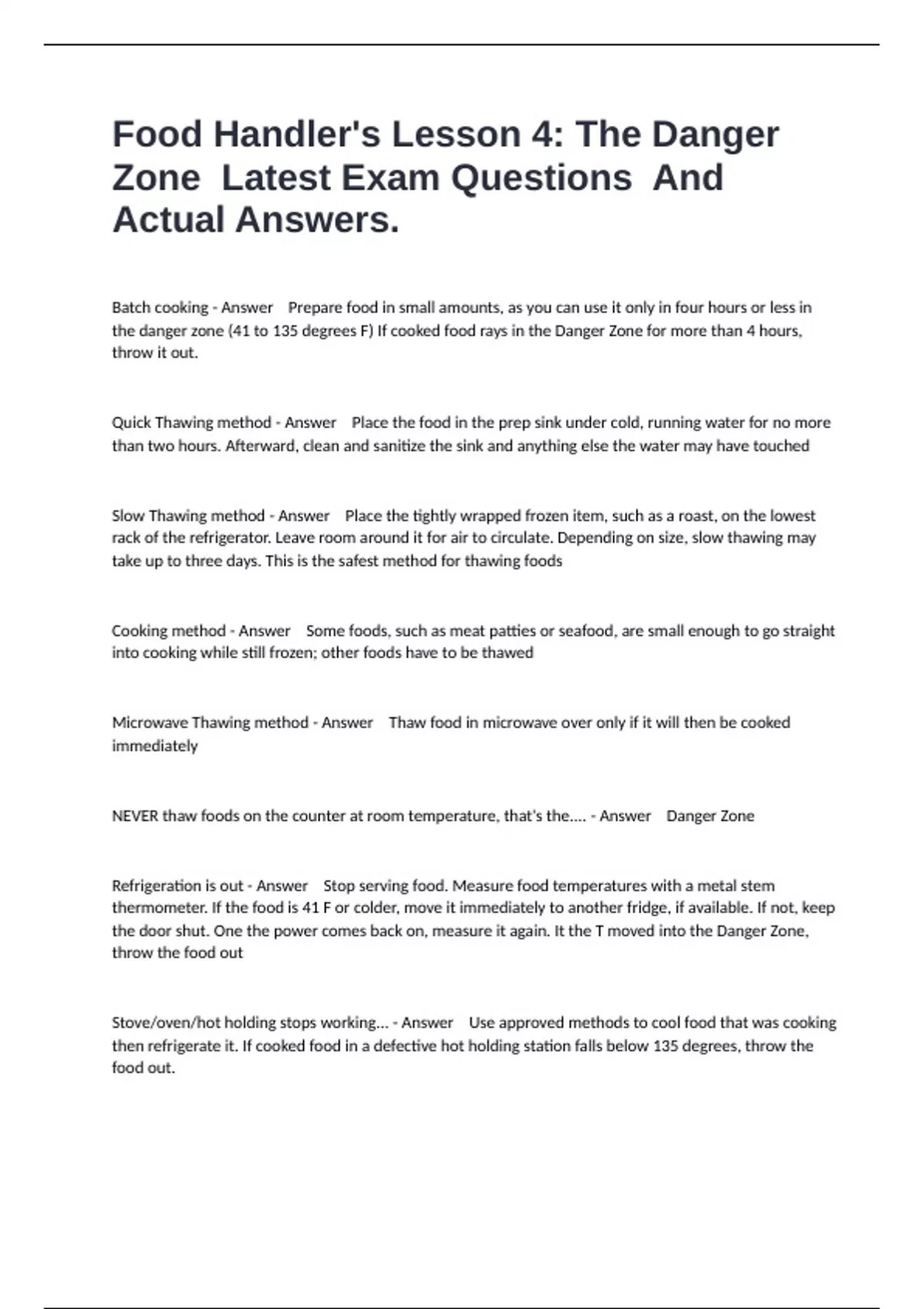 Food Handler's Lesson 4: The Danger Zone Latest Exam Questions And Actual Answers.