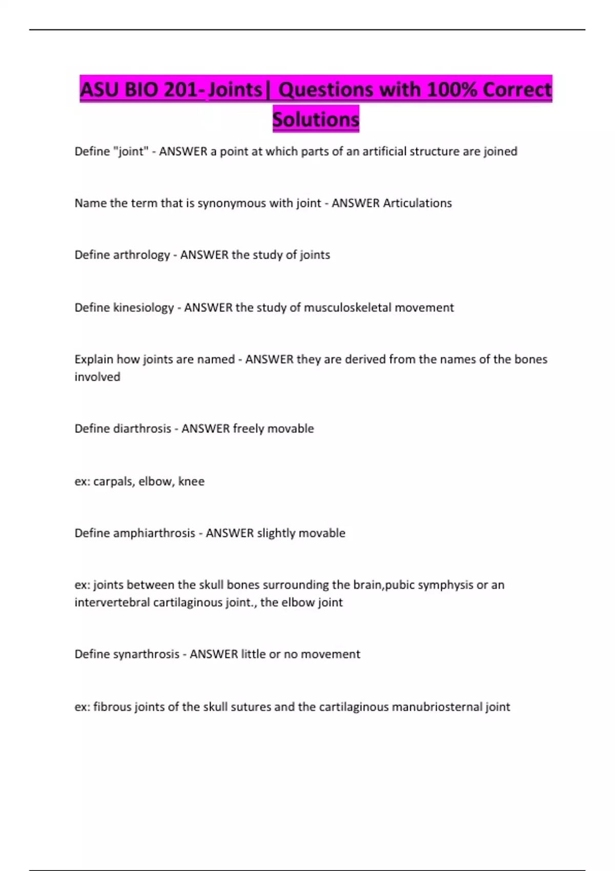 ASU BIO 201- Joints| Questions with 100% Correct Solutions