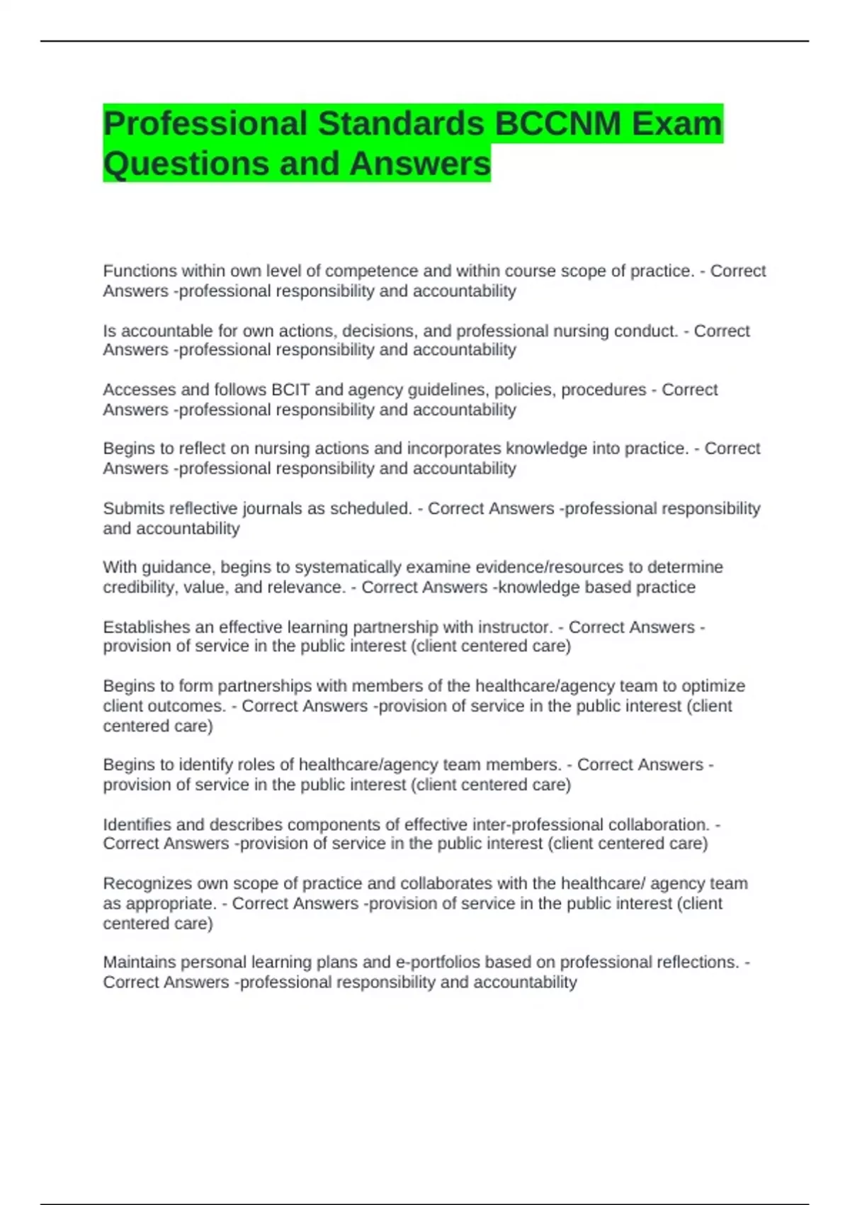 Correct Answers -professional responsibility and accountability