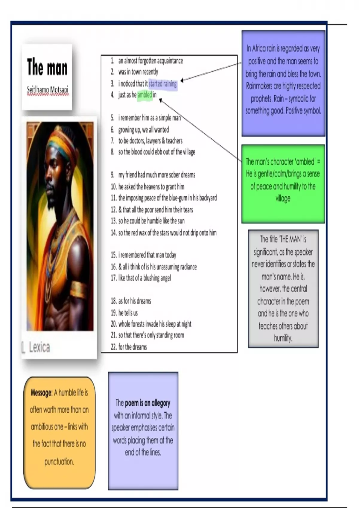 Summary The man by Seithlhamo Motsapi--A detailed poem analysis by @ Juffrou Ansie. A compact and colourful analysis based on previous exam papers!