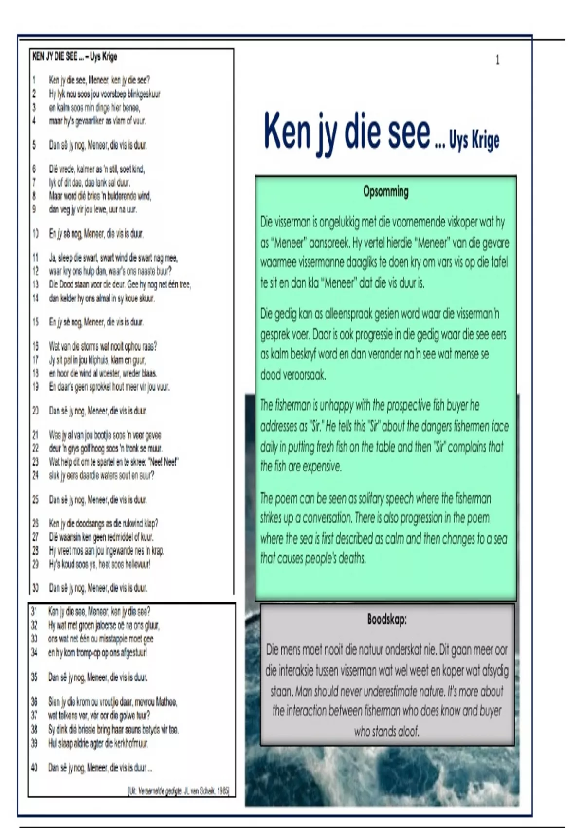 Die gedig kan as alleenspraak gesien word waar die visserman ʼn