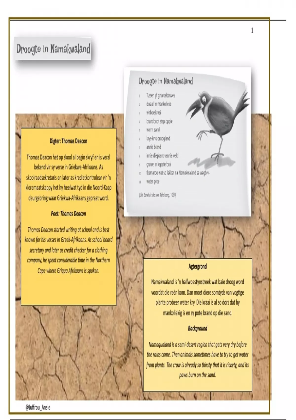 Droogte in Namakwaland-Agtergrond Namakwaland is ‘n halfwoestynstreek wat baie droog word voordat die reën kom. Dan moet diere somtyds van vogtige plante probeer water kry. Die kraai is al so dors dat hy mankoliekig is en sy pote brand op die sand. Background Namaqualand is a semi-desert region that gets very dry before the rains come. Then animals sometimes have to try to get water from plants. The crow is already so thirsty that it is rickety, and its paws burn on the sand.