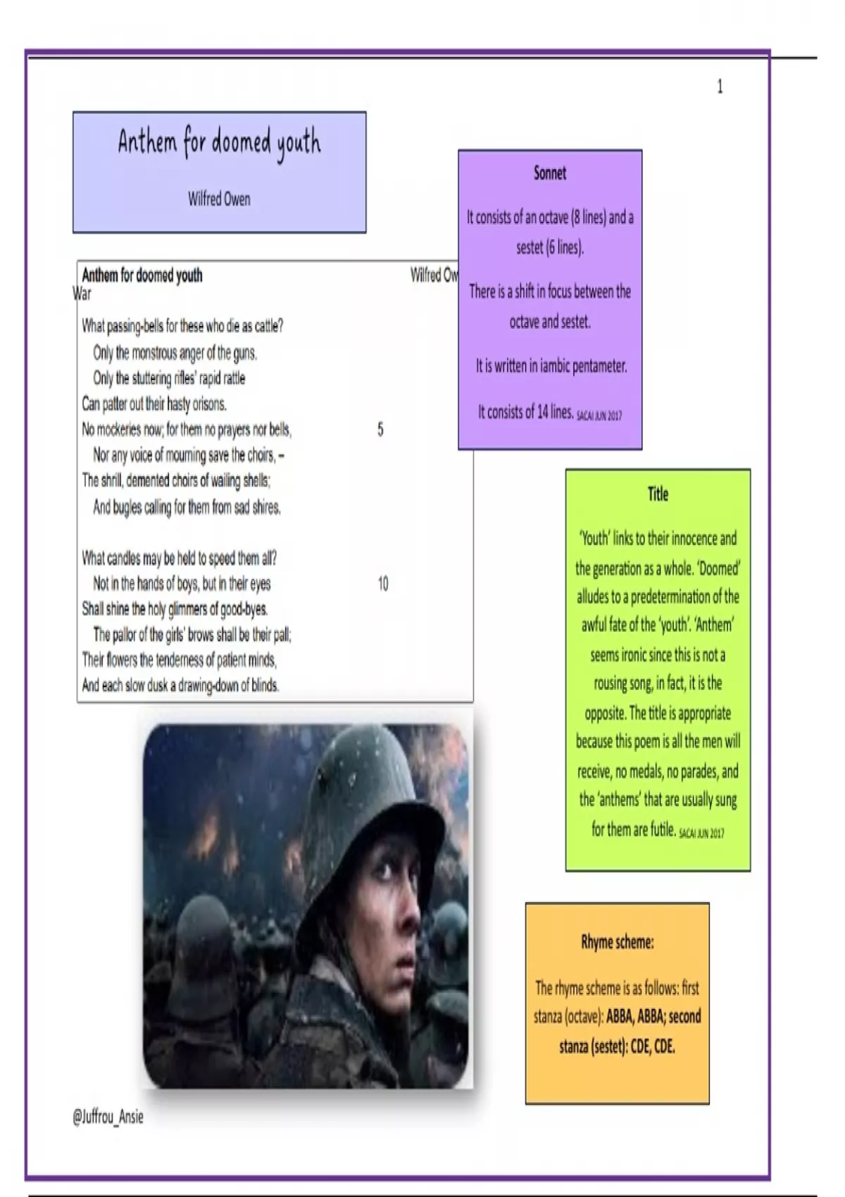 Summary Anthem for doomed youth by Wilfred Owen---a detailed analysis by @ Juffrou Ansie--Essay question SACAI NOV 2018 In an essay of 150 – 200 words, discuss how Owen’s use of diction and imagery emphasizes the contrast between a death.....