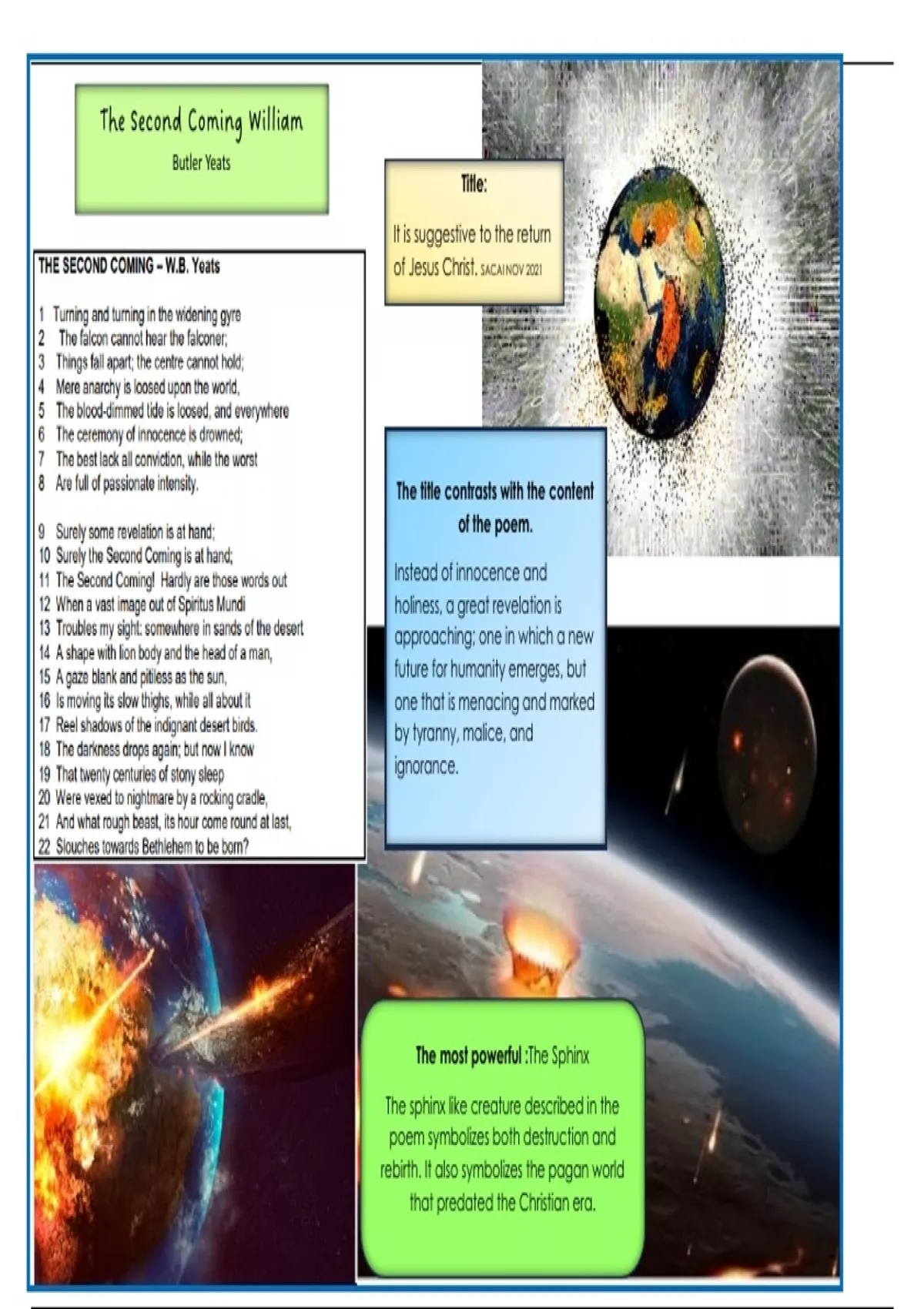 The second coming--What does The Second Coming symbolize? While the Second Coming means the return of Christ and a new world order in the Christian tradition, Yeats uses it to describe the birth of a mysterious beast. The beast is meant to figuratively subvert the birth of Christ, end the age of morality, and usher in an age of evil! POETRY – ESSAY QUESTION (EC/NOVEMBER 2020) In a carefully planned essay, critically discuss how the poet uses diction, imagery and tone to suggest a future world characterised by violence and chaos. Your essay must be 200–250 words (about ONE page) in length. Colourful and compact, various topics discussed Paragraph questions included.