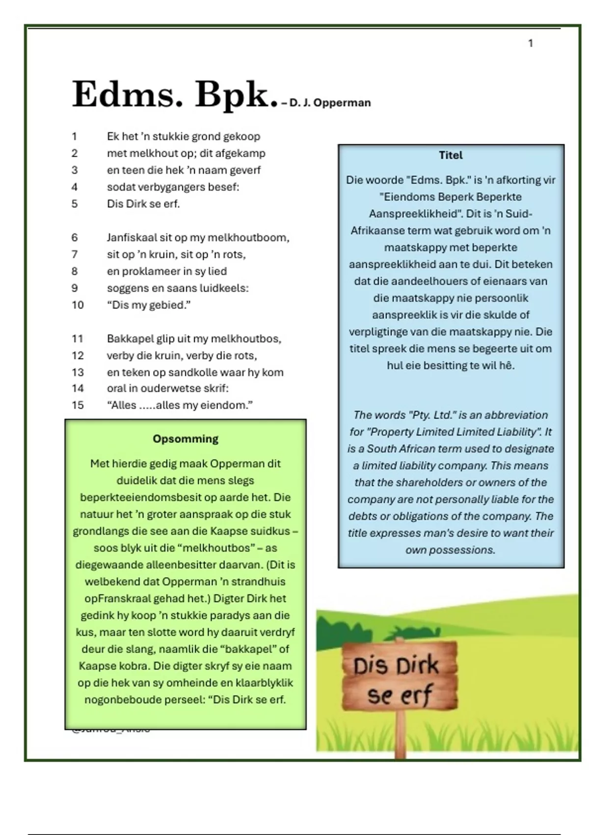 Edms. Bpk-- Kleurvol en kompakte ontleding. Perfek vir die leerders wat sukkel met letterkunde. Die belangrikste konsepte en inligting word gedek. Versvorm en Tema word bespreek. Stylfigure, beeldspraak en gedigstruktuur notas ingesluit. Gedigsbespreking per lyn en strofe. Gebasseer op vorige eksamen en toetsvrae!
