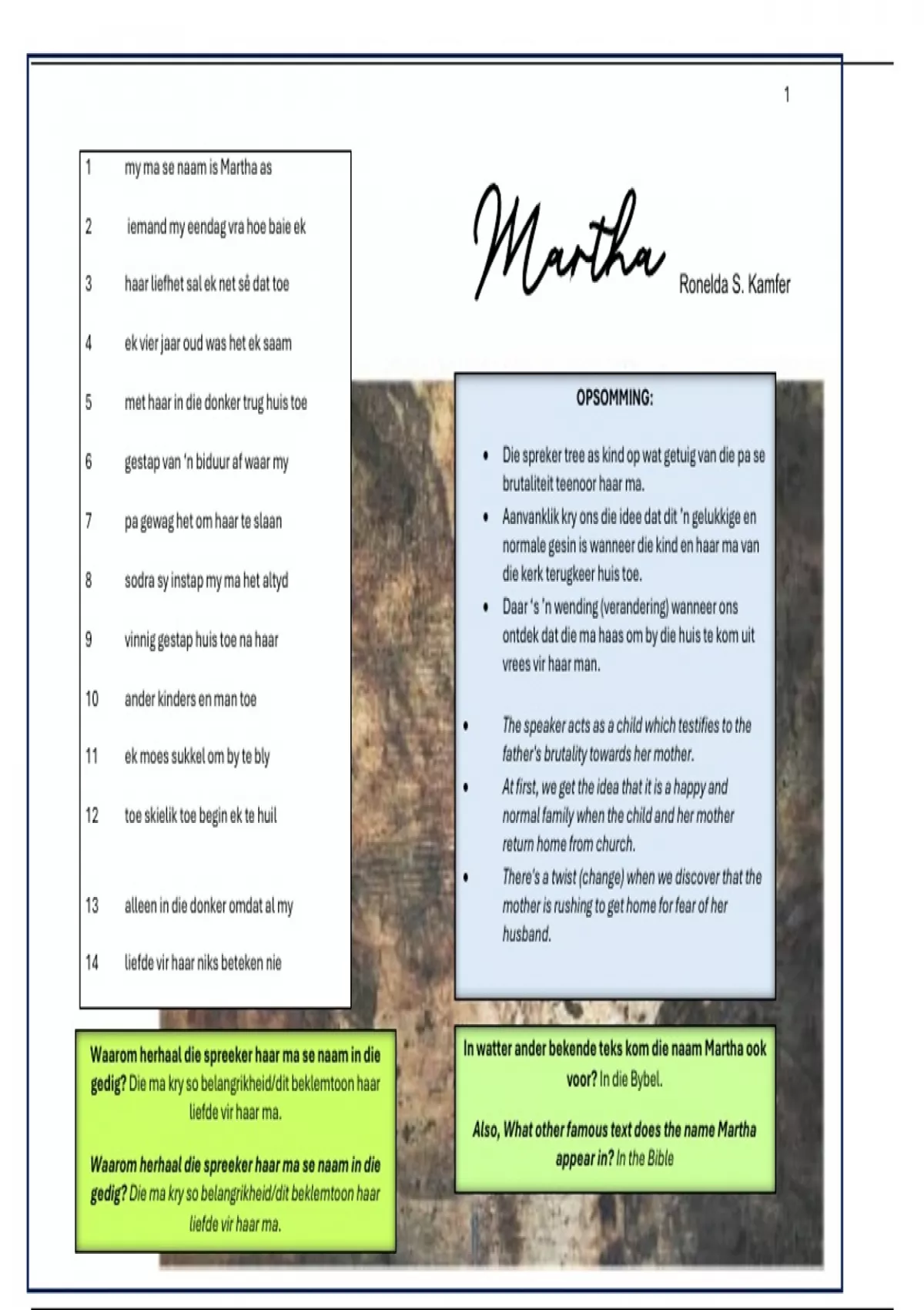 Summary Martha , 'n gedig van Ronelda S. Kamfer---Opgesom deur @ Juffrou Ansie, gebasser op vorige eksamen en toets vrae!
