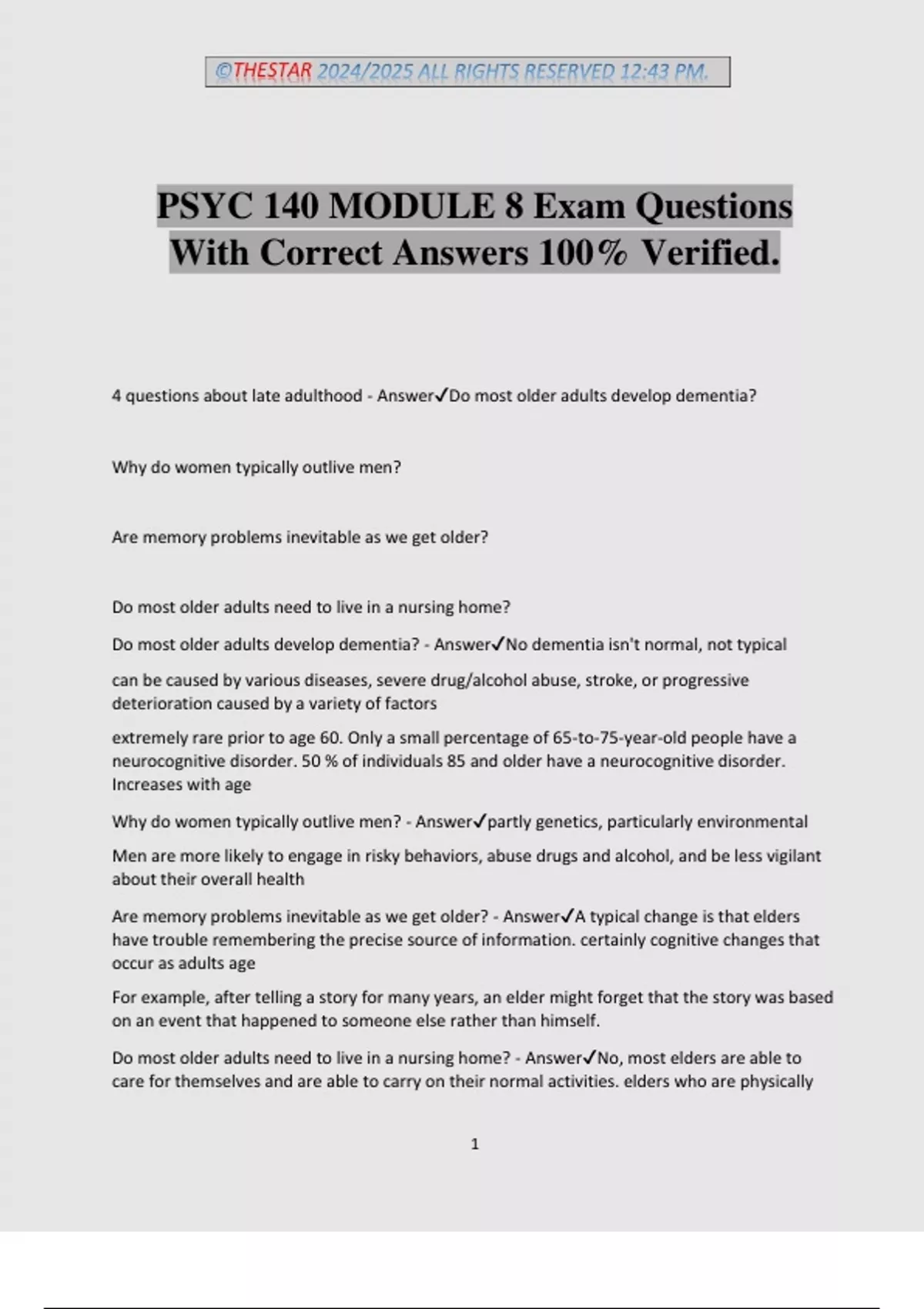 4 questions about late adulthood - Answer✔Do most older adults develop dementia?