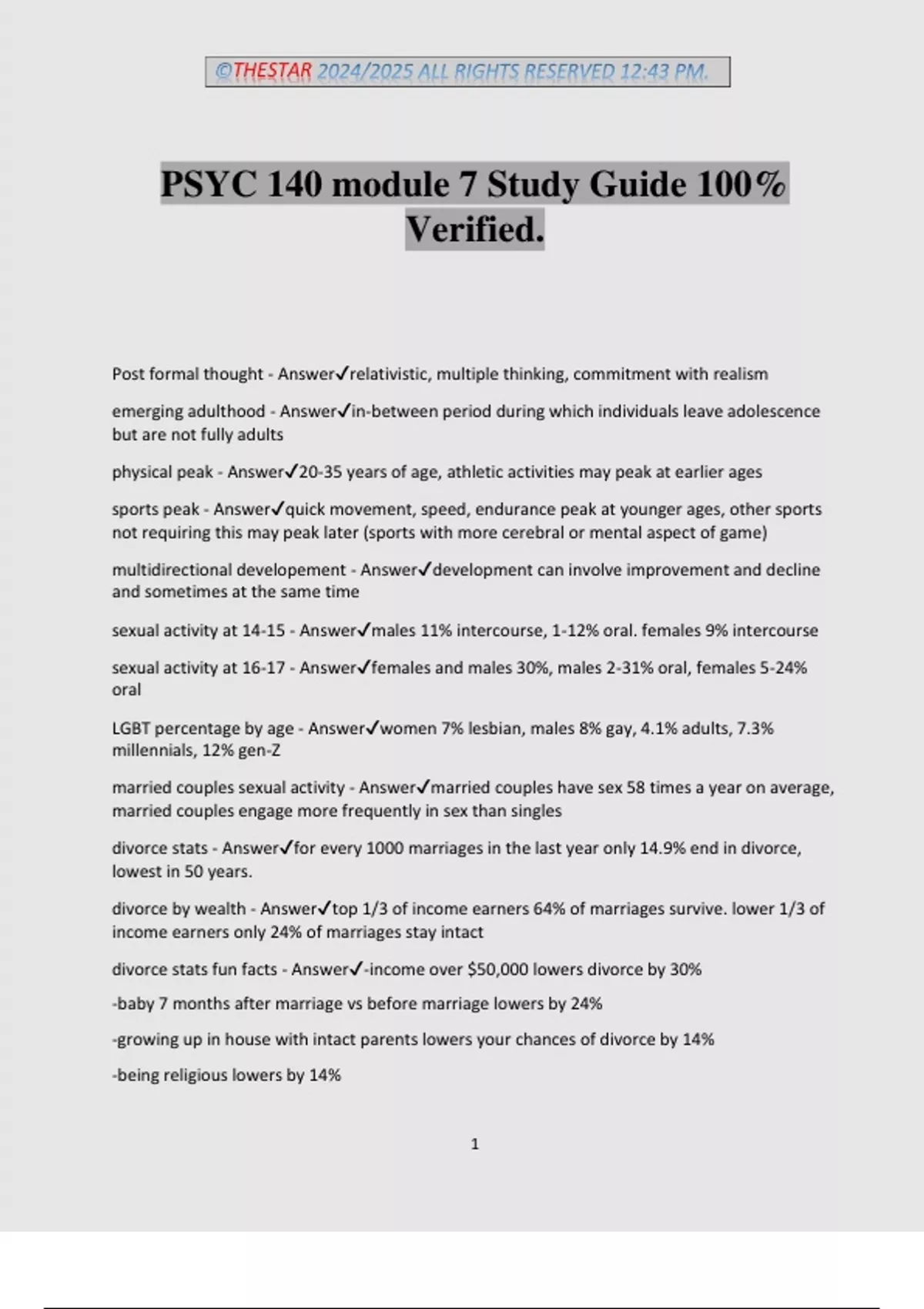 ©THESTAR 2024/2025 ALL RIGHTS RESERVED 12:43 PM. 1 PSYC 140 module 7 Study Guide 100% Verified. Post formal thought - Answerrelativistic, multiple thinking, commitment with realism emerging adulthood - Answerin-between period during which individuals leave adolescence but are not fully adults physical peak - Answer20-35 years of age, athletic activities may peak at earlier ages sports peak - Answerquick movement, speed, endurance peak at younger ages, other sports not requiring this may peak later (sports with more cerebral or mental aspect of game) multidirectional developement - Answerdevelopment can involve improvement and decline and sometimes at the same time sexual activity at 14-15 - Answermales 11% intercourse, 1-12% oral. females 9% intercourse sexual activity at 16-17 - Answerfemales and males 30%, males 2-31% oral, females 5-24% oral LGBT percentage by age - Answerwomen 7% lesbian, males 8% gay, 4.1% adults, 7.3% millennials, 12% gen-Z married couples sexual activity - Answermarried couples have sex 58 times a year on average, married couples engage more frequently in sex than singles divorce stats - Answerfor every 1000 marriages in the last year only 14.9% end in divorce, lowest in 50 years. divorce by wealth - Answertop 1/3 of income earners 64% of marriages survive. lower 1/3 of income earners only 24% of marriages stay intact divorce stats fun facts - Answer-income over $50,000 lowers divorce by 30% -baby 7 months after marriage vs before marriage lowers by 24% -growing up in house with intact parents lowers your chances of divorce by 14% -being religious lowers by 14%