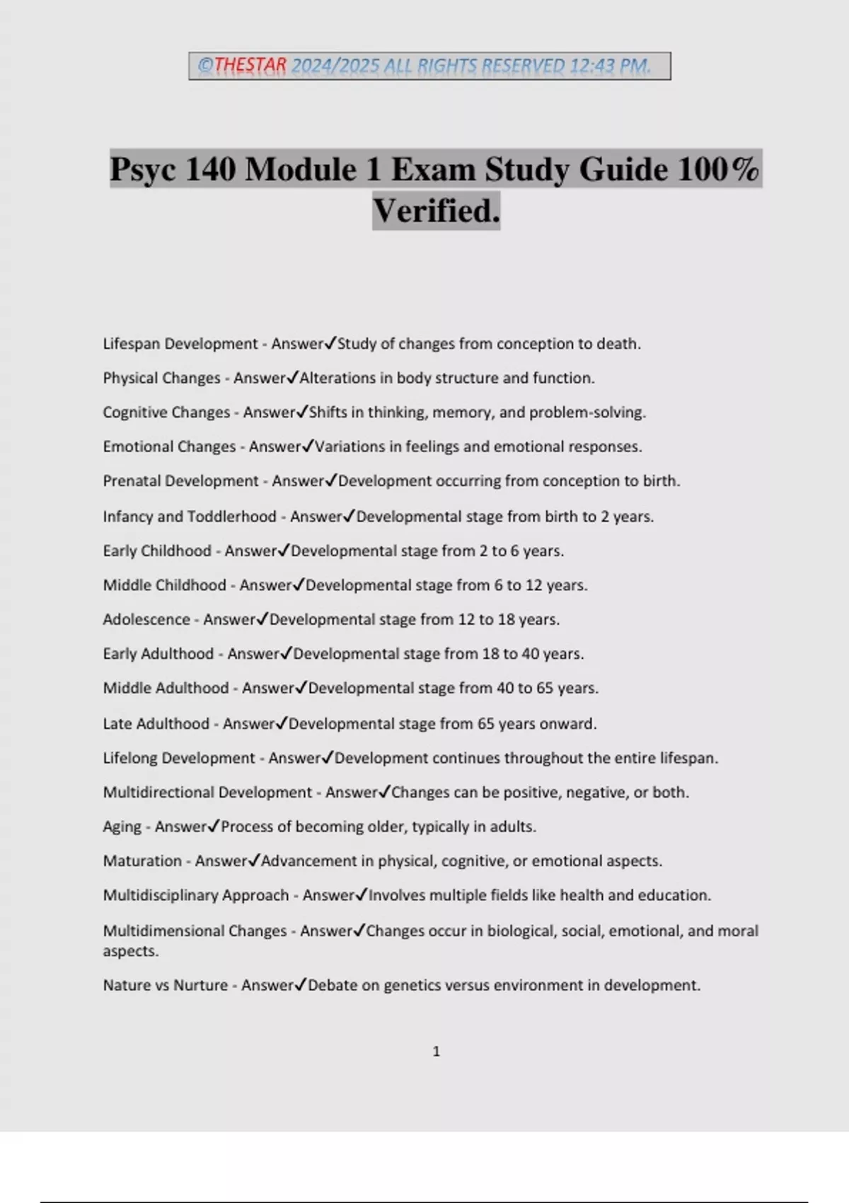 Lifespan Development - Answer✔Study of changes from conception to death.