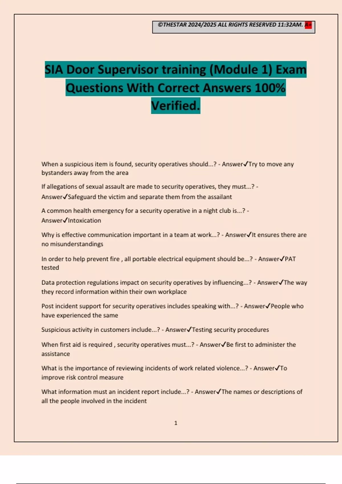 ©THESTAR 2024/2025 ALL RIGHTS RESERVED 11:32AM. A+ 1 SIA Door Supervisor training (Module 1) Exam Questions With Correct Answers 100% Verified. When a suspicious item is found, security operatives should...? - AnswerTry to move any bystanders away from the area If allegations of sexual assault are made to security operatives, they must...? - AnswerSafeguard the victim and separate them from the assailant A common health emergency for a security operative in a night club is...? - AnswerIntoxication Why is effective communication important in a team at work...? - AnswerIt ensures there are no misunderstandings In order to help prevent fire , all portable electrical equipment should be...? - AnswerPAT tested Data protection regulations impact on security operatives by influencing...? - AnswerThe way they record information within their own workplace Post incident support for security operatives includes speaking with...? - AnswerPeople who have experienced the same Suspicious activity in customers include...? - AnswerTesting security procedures When first aid is required , security operatives must...? - AnswerBe first to administer the assistance What is the importance of reviewing incidents of work related violence...? - AnswerTo improve risk control measure What information must an incident report include...? - AnswerThe names or descriptions of all the people involved in the incident ©THESTAR 2024/2025 ALL RIGHTS RESERVED 11:32AM. A+ 2 The four "Cs" used when dealing with suspicious items are...? - AnswerConfirm Clear Communicate and Control Why is arresting someone a last resort for a security operative...? - AnswerIf a wrongful arrest is made , then the person may take legal action against the operative What can security operatives do to keep information safe...? - AnswerDo not discuss work related issues outside the workplace One limitation of CCTV for a security operative is...? - AnswerThe equipment is easily damaged or vandalized What are the three components of the 'triangle of fire...? - AnswerFuel Heat and Oxygen Why is accurate record keeping important to the security operatives...? - AnswerIt helps to comply with the law Name a criminal offence...? - AnswerArson What action should you take when an individual leaving a venue has been identified as vulnerable and at risk of harm...? - AnswerCall a licensed taxi to take them home What is a key action to help prevent terror attacks...? - AnswerBe vigilant and identify any attack planning phases When dealing with customers , what must security operatives be aware of...? - AnswerWhat the customers expectations are What is the difference between Civil and Criminal law...? - AnswerCriminal law is heard by a judge , whilst Civil law is held by a justice of the peace What is a common workplace hazard...? - AnswerA slippery floor How would a security officer know what route to follow when carrying out a patrol...? - AnswerBy reading the assignment instructions (AIs) When attending court to give evidence , security operatives should...? - AnswerRead from their notebook to help them