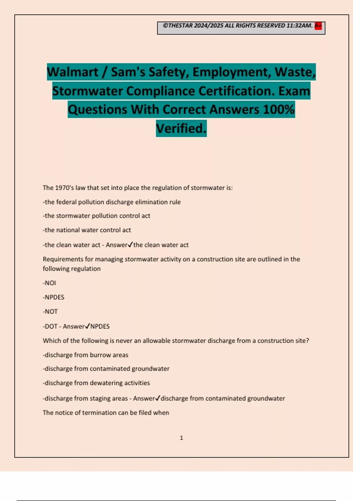 Walmart / Sam's Safety, Employment, Waste, Stormwater Compliance Certification. Exam Questions With Correct Answers 100% Verified.