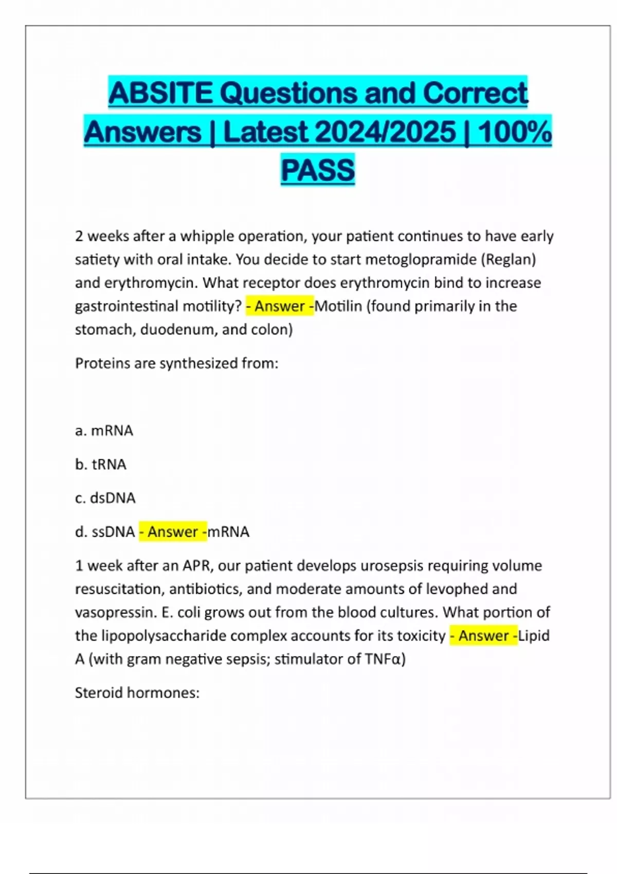 ABSITE Questions and Correct Answers | Latest 2024/2025 | 100% PASS 2 weeks after a whipple operation, your patient continues to have early satiety with oral intake. You decide to start metoglopramide (Reglan) and erythromycin. What receptor does erythromycin bind to increase gastrointestinal motility? - Answer -Motilin (found primarily in the stomach, duodenum, and colon) Proteins are synthesized from: a. mRNA b. tRNA c. dsDNA d. ssDNA - Answer -mRNA 1 week after an APR, our patient develops urosepsis requiring volume resuscitation, antibiotics, and moderate amounts of levophed and vasopressin. E. coli grows out from the blood cultures. What portion of the lipopolysaccharide complex accounts for its toxicity - Answer -Lipid A (with gram negative sepsis; stimulator of TNFα) Steroid hormones:a. Bind a receptor on the plasma membrane and activate a plasma membrane enzyme b. Bind a cytoplasmic receptor, enter the nucleus, and affect transcription of proteins c. Bind a receptor in the nucleus and affect