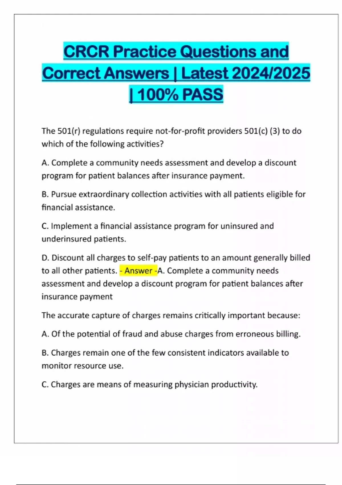 CRCR Practice Questions and Correct Answers | Latest 2024/2025 | 100% PASS The 501(r) regulations require not-for-profit providers 501(c) (3) to do which of the following activities? A. Complete a community needs assessment and develop a discount program for patient balances after insurance payment. B. Pursue extraordinary collection activities with all patients eligible for financial assistance. C. Implement a financial assistance program for uninsured and underinsured patients. D. Discount all charges to self-pay patients to an amount generally billed to all other patients. - Answer -A. Complete a community needs assessment and develop a discount program for patient balances after insurance payment The accurate capture of charg