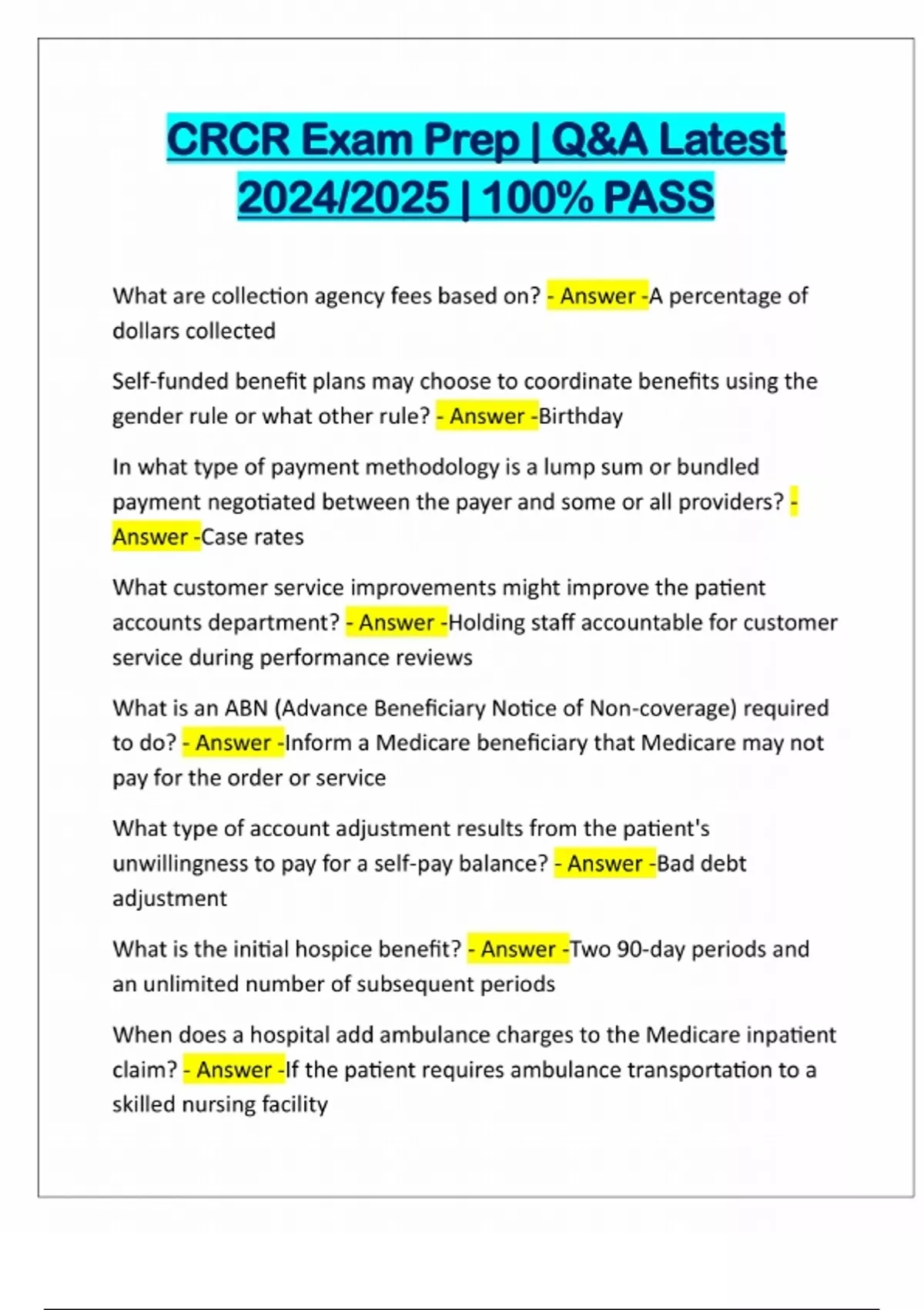 CRCR Exam Prep | Q&A Latest 2024/2025 | 100% PASS What are collection agency fees based on? - Answer -A percentage of dollars collected Self-funded benefit plans may choose to coordinate benefits using the gender rule or what other rule? - Answer -Birthday In what type of payment methodology is a lump sum or bundled payment negotiated between the payer and some or all providers? - Answer -Case rates What customer service improvements might impro