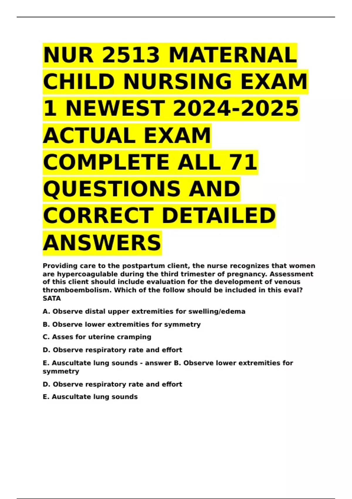 NUR 2513 MATERNAL CHILD NURSING EXAM 1 NEWEST ACTUAL EXAM COMPLETE