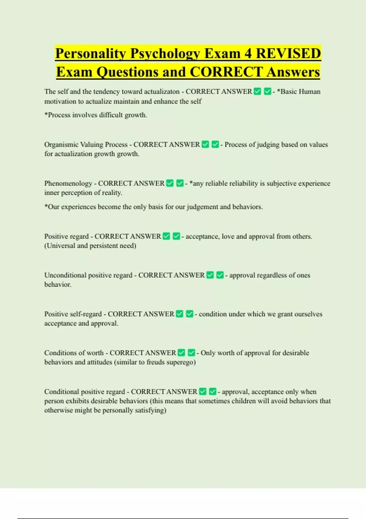 Personality Psychology Exam 4 REVISED Exam Questions and CORRECT Answers The self and the tendency toward actualizaton - CORRECT ANSWER - *Basic Human motivation to actualize maintain and enhance the self *Process involves difficult growth. Organismic Valuing Process - CORRECT ANSWER - Process of judging based on values for actualization growth growth