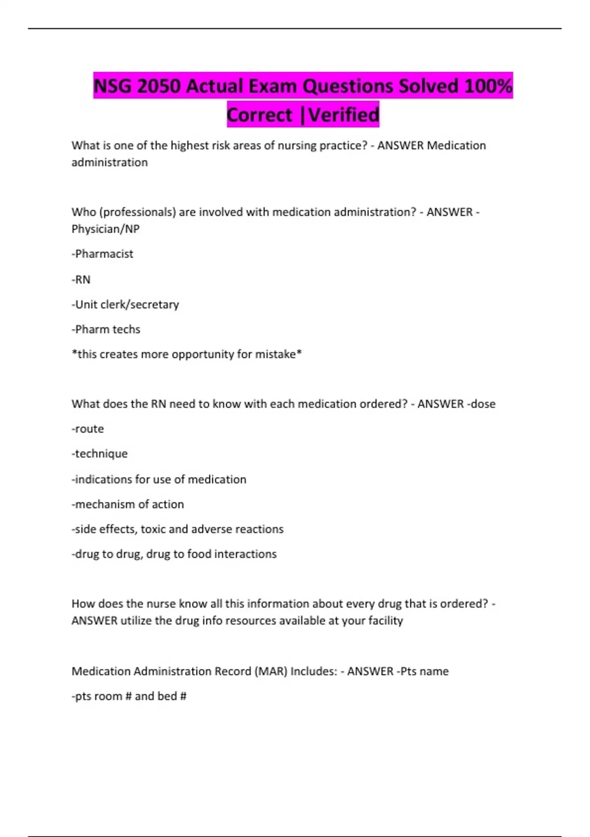 Medication Administration Record (MAR) Includes: - ANSWER -Pts name