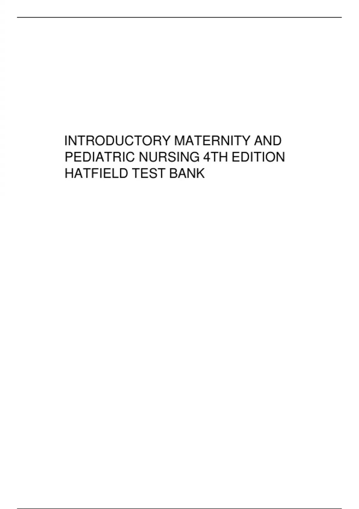 Get fully prepared for your nursing exams with the verified test bank for Introductory Maternity and Pediatric Nursing, 4th Edition by Gloria Leifer Hatfield. This comprehensive test bank covers essential topics in maternity and pediatric nursing, including prenatal care, labor and delivery, newborn care, pediatric health assessments, common childhood diseases, and family-centered nursing care. The test bank includes multiple-choice, true/false, and application-based questions with accurate answers and clear rationales. Perfect for nursing students in maternity and pediatric courses, this professionally formatted test bank is instantly downloadable and ideal for exam preparation.