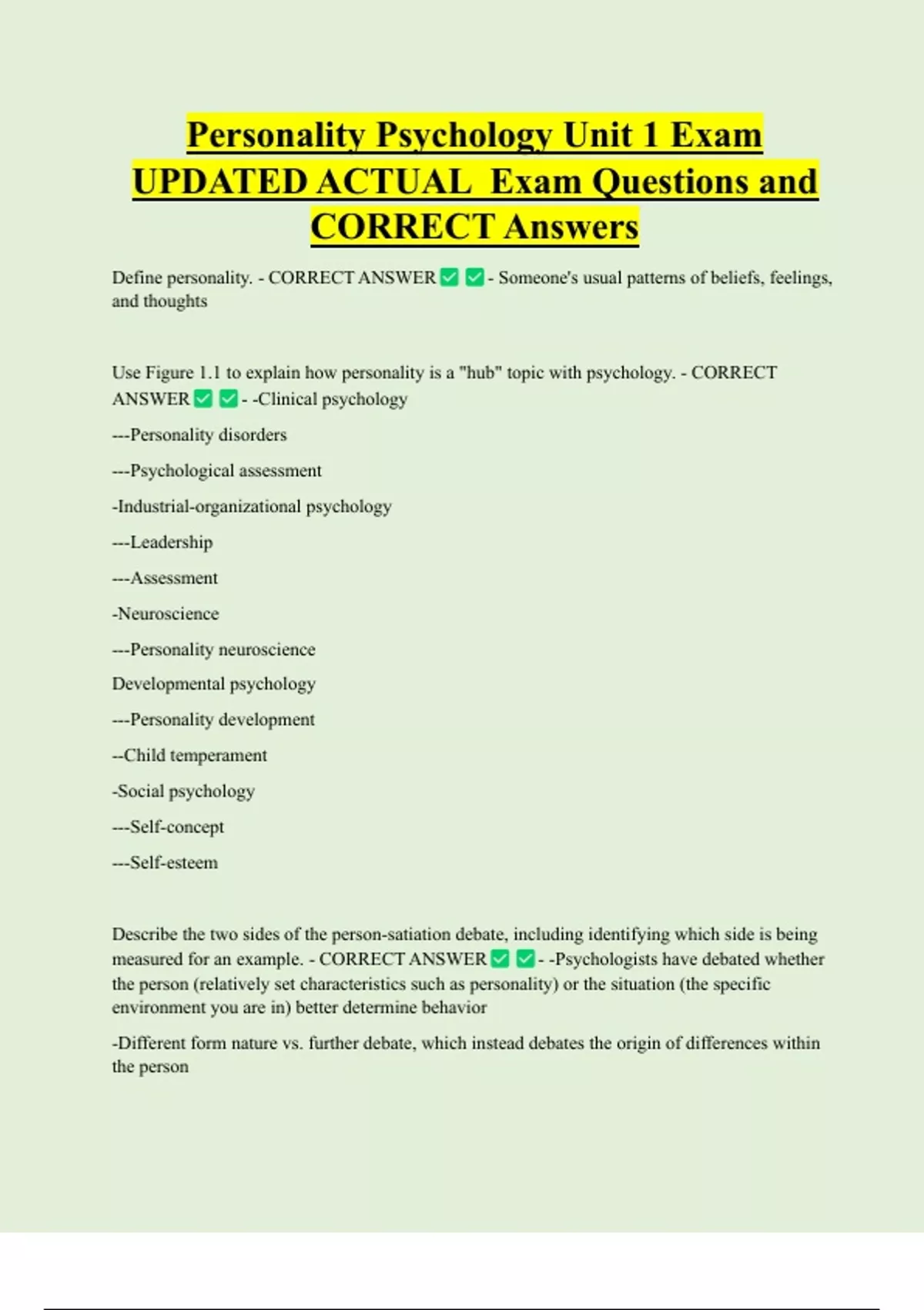 Personality Psychology Unit 1 Exam UPDATED ACTUAL Exam Questions and CORRECT Answers Define personality. - CORRECT ANSWER - Someone's usual patterns of beliefs, feelings, and thoughts Use Figure 1.1 to explain how personality is a "hub" topic with psychology. - CORRECT ANSWER - -Clinical psychology
