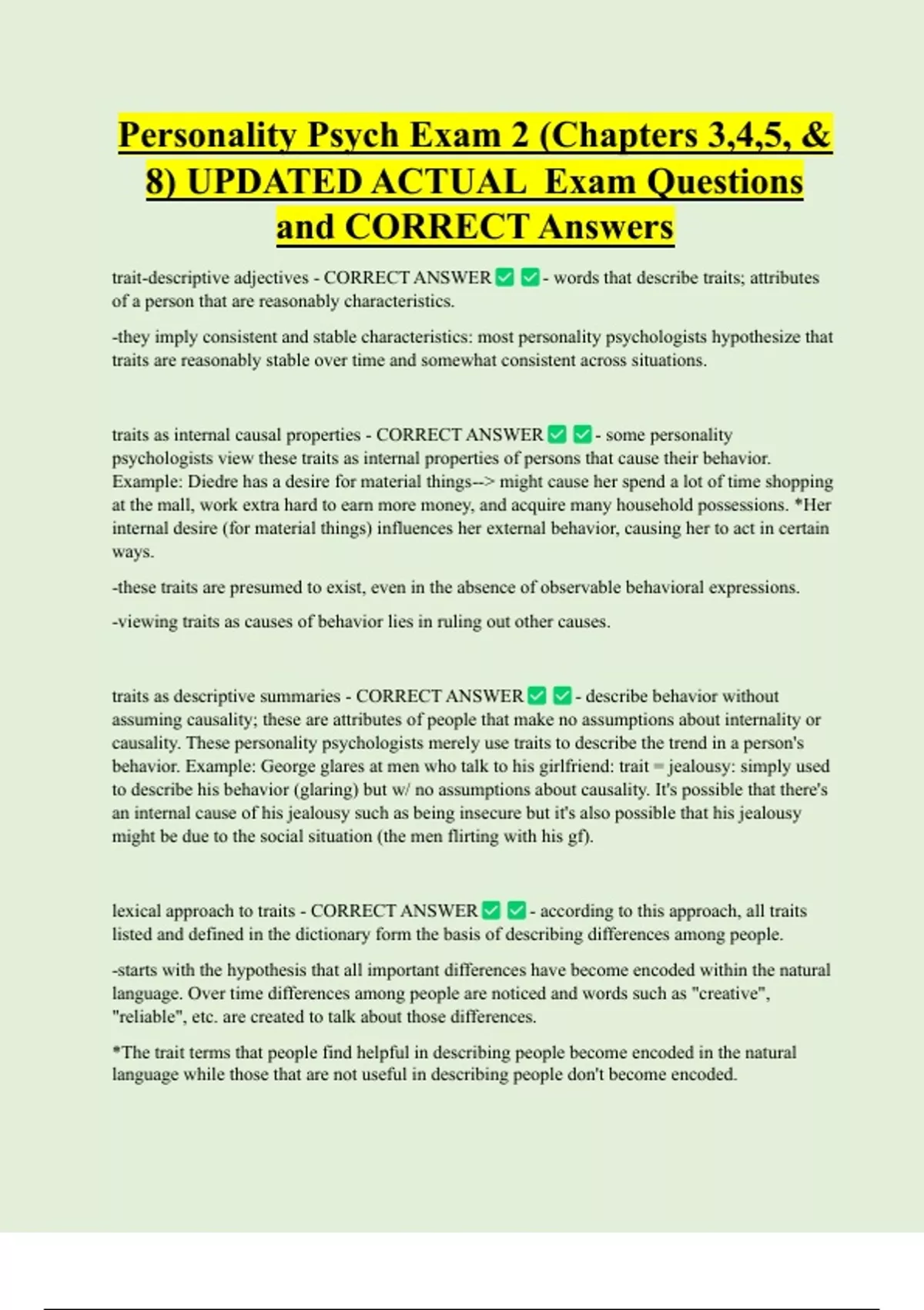 Personality Psych Exam 2 (Chapters 3,4,5, & 8) UPDATED ACTUAL Exam Questions and CORRECT Answers trait-descriptive adjectives - CORRECT ANSWER - words that describe traits; attributes of a person that are reasonably characteristics. -they imply consistent and stable characteristics: most personality psychologists hypothesize that traits are reasonably stable over time and somewhat consistent across situations