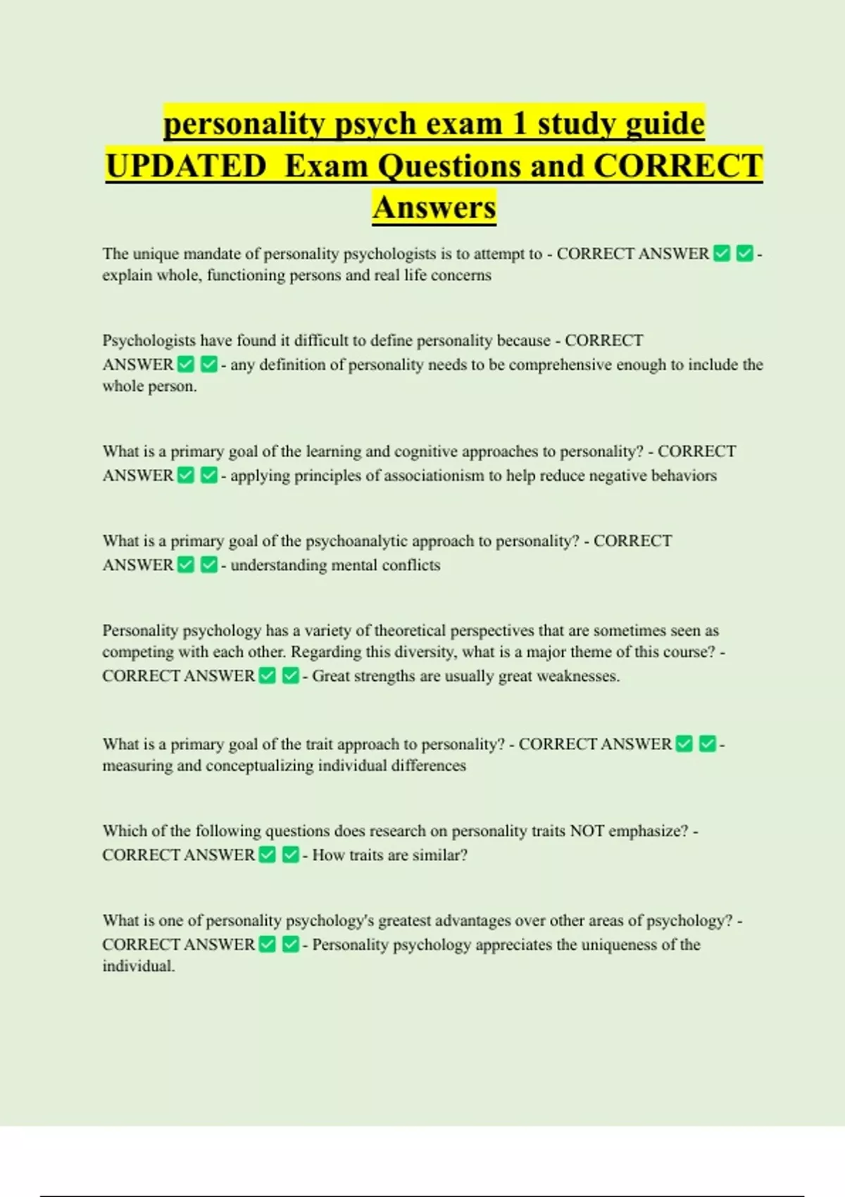 personality psych exam 1 study guide UPDATED Exam Questions and CORRECT Answers The unique mandate of personality psychologists is to attempt to - CORRECT ANSWER - explain whole, functioning persons and real life concerns Psychologists have found it difficult to define personality because - CORRECT ANSWER - any definition of personality needs to be comprehensive enough to include the whole person