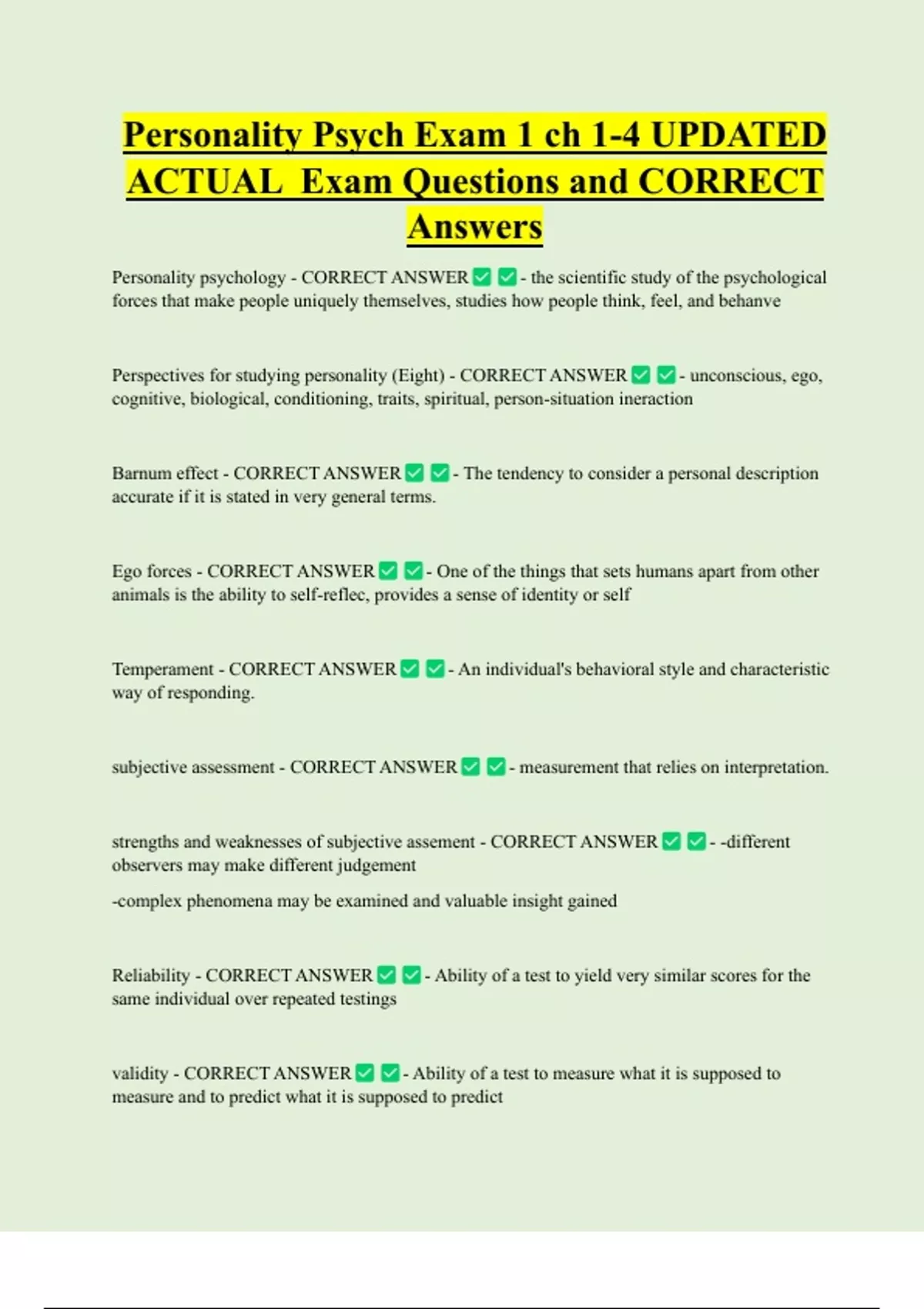 Personality Psych Exam 1 ch 1-4 UPDATED ACTUAL Exam Questions and CORRECT Answers Personality psychology - CORRECT ANSWER - the scientific study of the psychological forces that make people uniquely themselves, studies how people think, feel, and behanve Perspectives for studying personality (Eight) - CORRECT ANSWER - unconscious, ego, cognitive, biological, conditioning, traits, spiritual, person-situation ineraction