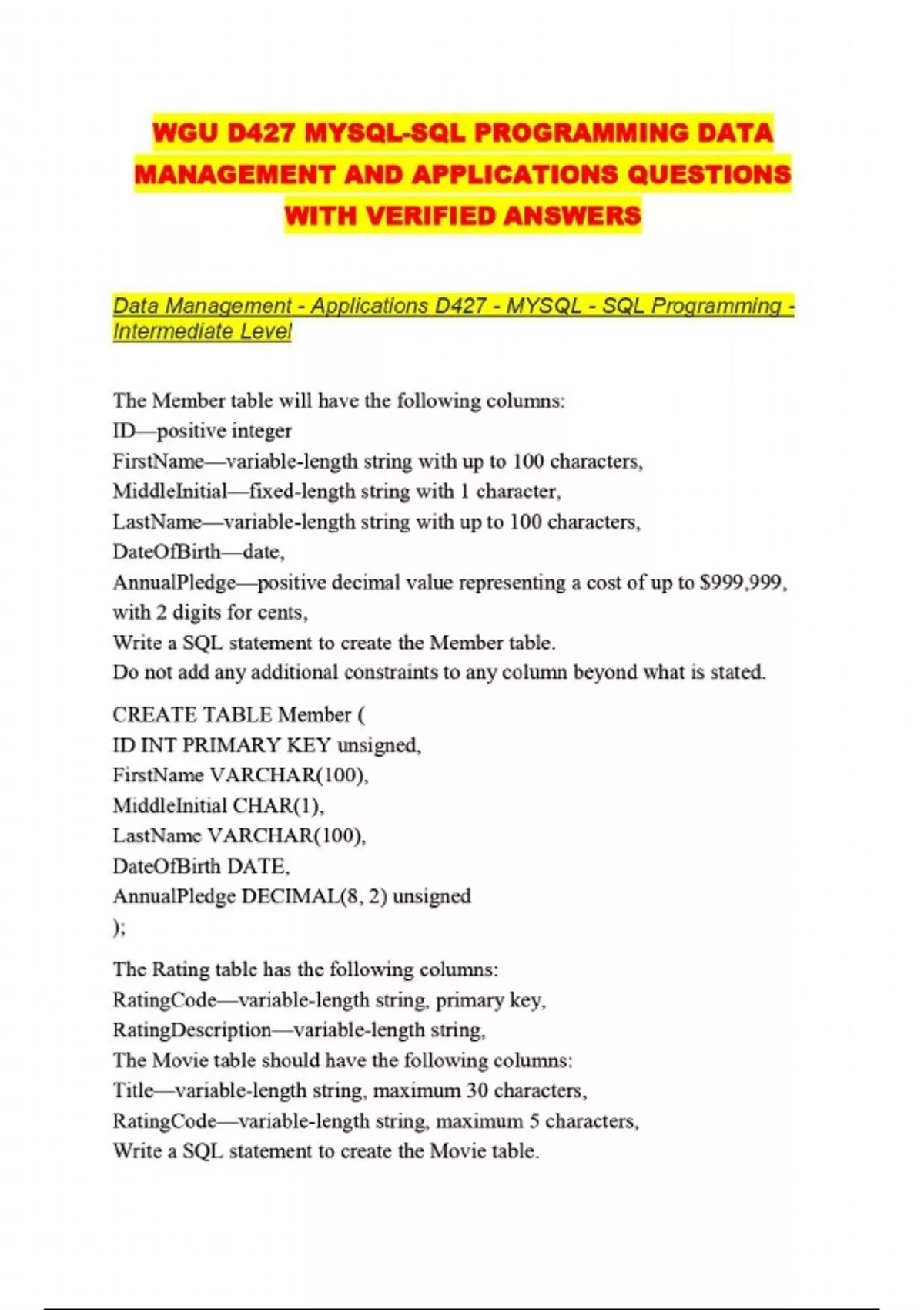 WGU D427 MYSQL-SQL PROGRAMMING DATA MANAGEMENT AND APPLICATIONS QUESTIONS WITH VERIFIED ANSWERS...