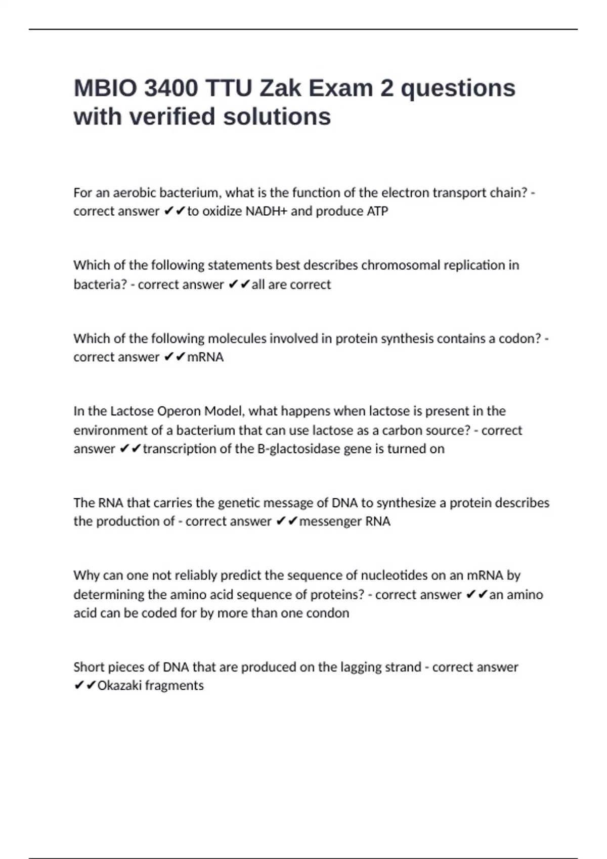 MBIO 3400 TTU Zak Exam 2 questions with verified solutions