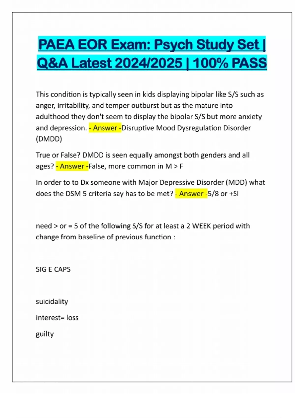 PAEA EOR Exam: Psych Study Set | Q&A Latest 2024/2025 | 100% PASS This condition is typically seen in kids displaying bipolar like S/S such as anger, irritability, and temper outburst but as the mature into adulthood they don't seem to display the bipolar S/S but more anxiety and depression. - Answer -Disruptive Mood Dysregulation Disorder (DMDD) True or False? DMDD is seen equally amongst both genders and all ages? - Answer -False, more common in M > F In order to to Dx someone with Major Depressive Disorder (MDD) what does the DSM 5 criteria say has to be met? - Answer -5/8 or +SI need > or = 5 of the following S/S for at least a 2 WEEK period with change from baseline of previous function : SIG E CAPS suicidality interest= loss guilt
