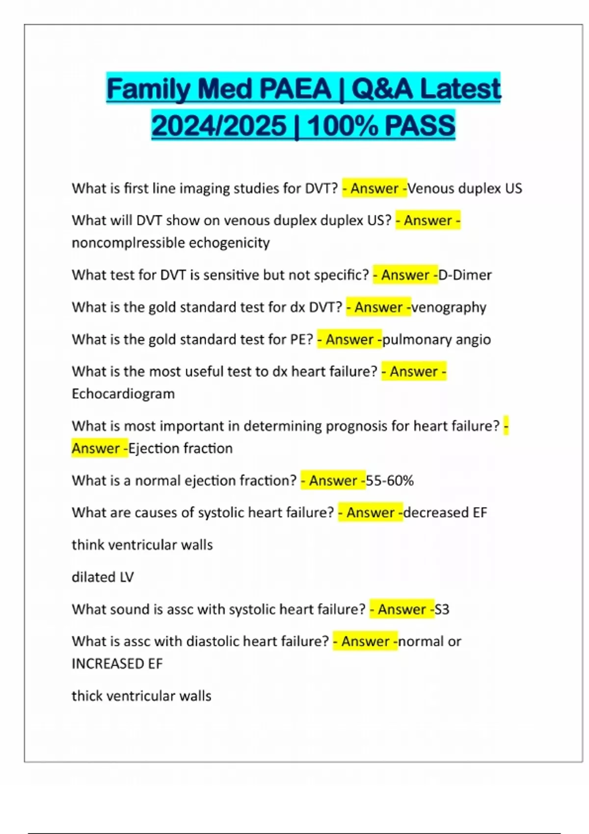 Family Med PAEA | Q&A Latest 2024/2025 | 100% PASS What is first line imaging studies for DVT? - Answer -Venous duplex US What will DVT show on venous duplex duplex US? - Answer - noncomplressible echogenicity What test for DVT is sensitive but not specific? - Answer -D-Dimer What is the gold standard test for dx DVT? - Answer -venography What is the gold standard test for PE? - Answer -pulmonary angio What is the most useful test to dx heart failure? - Answer - Echocardiogram What is most important in determining prognosis for heart failure? - Answer -Ejection fraction What is a normal ejection fraction? - Answer -55-60% What are causes of systolic heart failure? - Answer -decreased EF think ventricular walls dilated LV What sound is assc with systolic heart