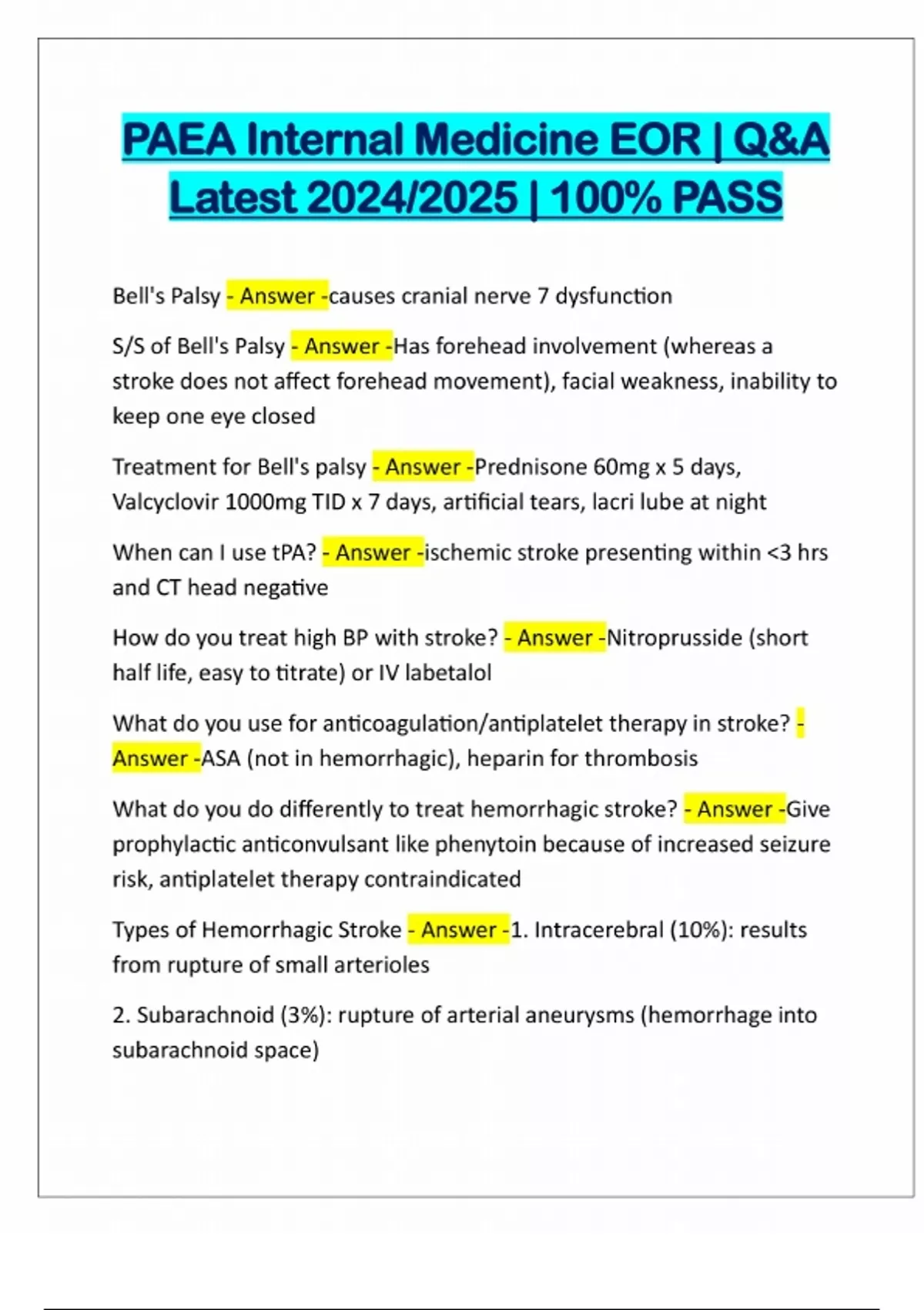 PAEA Internal Medicine EOR | Q&A Latest 2024/2025 | 100% PASS Bell's Palsy - Answer -causes cranial nerve 7 dysfunction S/S of Bell's Palsy - Answer -Has forehead involvement (whereas a stroke does not affect forehead movement), facial weakness, inability to keep one eye closed Treatment for Bell's palsy - Answer -Prednisone 60mg x 5 days, Valcyclovir 1000mg TID x 7 days, artificial tears, lacri lube at night When can I use tPA? - Answer -ischemic stroke presenting within <3 hrs and CT head negative How do you treat high BP with stroke? - Answer -Nitroprusside (short half life, easy to titrate) or IV labetalol What do you use for anticoagulation/antiplatelet therapy in stroke? - Answer -ASA (not in hemorrhagic), heparin for thrombosis What do you do differently to treat hemorrhagic stroke? - Answer -Give prophylactic anticonvulsant like phenytoin because of increased seizure risk, antiplatelet therapy contraindicated Types of Hemorrhagic Stroke - Answer -1. Intracerebral (10%): results from rupture of small arterioles 2. Subarachnoid (3%): rupture of arterial ane