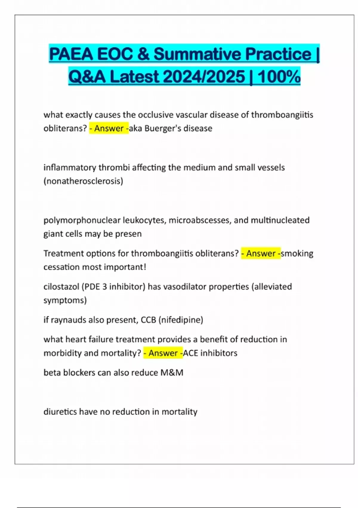 PAEA EOC & Summative Practice | Q&A Latest 2024/2025 | 100% what exactly causes the occlusive vascular disease of thromboangiitis obliterans? - Answer -aka Buerger's disease inflammatory thrombi affecting the medium and small vessels (nonatherosclerosis) polymorphonuclear leukocytes, microabscesses, and multinucleated giant cells may be presen Treatment options for thromboangiitis obliterans? - Answer -smoking cessation most important! cilostazol (PDE 3 inhibitor) has vasodilator properties (alleviated symptoms) if raynauds also present, CCB (nifedipine) what heart failure treatment provides a benefit of reduction in morbidity and mortality? - Answer -ACE inhibitors beta blockers can also reduce M&M