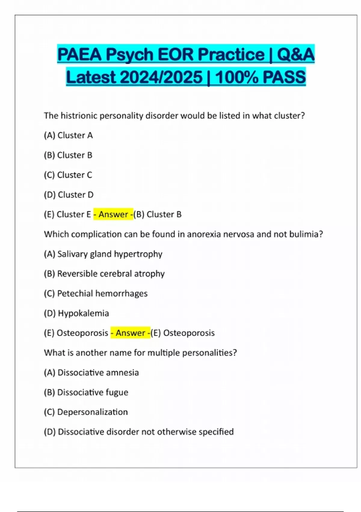 PAEA Psych EOR Practice | Q&A Latest 2024/2025 | 100% PASS The histrionic personality disorder would be listed in what cluster? (A) Cluster A (B) Cluster B (C) Cluster C (D) Cluster D (E) Cluster E - Answer -(B) Cluster B Which complication can be found in anorexia nervosa and not bulimia? (A) Salivary gland hypertrophy (B) Reversible cerebral atrophy (C) Petechial hemorrhages (D) Hypokalemia (E) Osteoporosis - Answer -(E) Osteoporosis What is another name for multiple personalities? (A) Dissociative amnesia