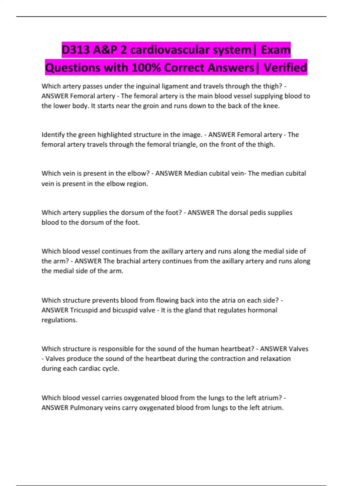 D313 A&P 2 cardiovascular system| Exam Questions with 100% Correct Answers| Verified