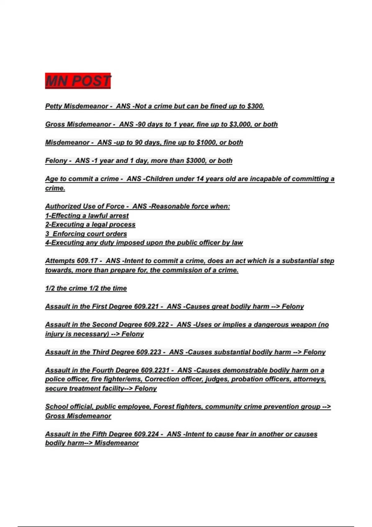 Assault in the Second Degree 609.222 - ANS -Uses or implies a dangerous weapon (no