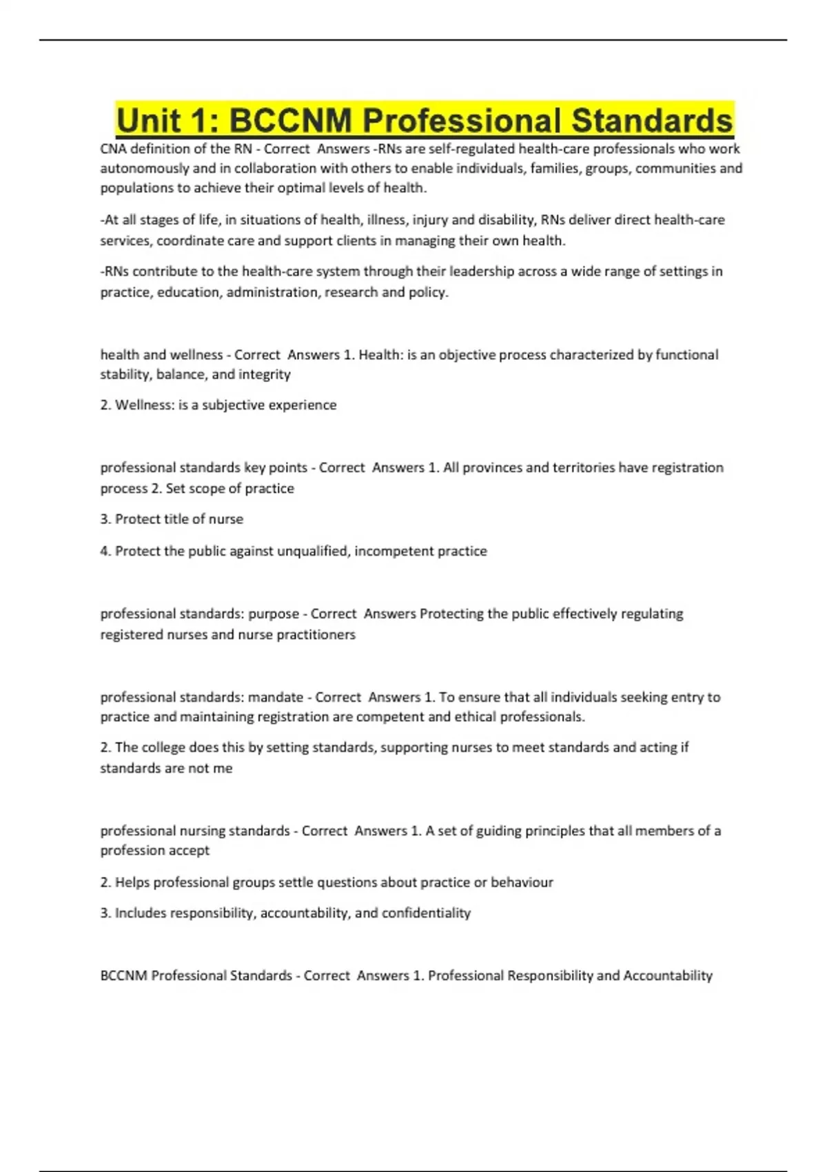 Unit 1: BCCNM Professional Standards CNA definition of the RN - Correct Answers -RNs are self-regulated health-care professionals who work autonomously and in collaboration with others to enable individuals, families, groups, communities and populations to achieve their optimal levels of health. -At all stages of life, in situations of health, illness, injury and disability, RNs deliver direct health-care services, coordinate care and support clients in managing their own health. -RNs contribute to the health-care system through their leadership across a wide range of settings in practice, education, administration, research and policy. health and wellness - Correct Answers 1. Health: is an objective process characterized by functional stability, balance, and integrity 2. Wellness: is a subjective experience professional standards key points - Correct Answers 1. All provinces and territories have registration process 2. Set scope of practice 3. Protect title of nurse 4. Protect the public against unqualified, incompetent practice professional standards: purpose - Correct Answers Protecting the public effectively regulating registered nurses and nurse practitioners professional standards: mandate - Correct Answers 1. To ensure that all individuals seeking entry to practice and maintaining registration are competent and ethical professionals. 2. The college does this by setting standards, supporting nurses to meet standards and acting if standards are not me professional nursing standards - Correct Answers 1. A set of guiding principles that all members of a profession accept 2. Helps professional groups settle questions about practice or behaviour 3. Includes responsibility, accountability, and confidentiality BCCNM Professional Standards - Correct Answers 1. Professional Responsibility and Accountability 2. Knowledge-Based Practice 3. Client-Focused Provision of Service 4. Ethical Practice application of standards - Correct Answers Professional standards applied to four areas of practice: 1. Clinical 2. Education 3. Administration 4. Research Standard 1: Professional Responsibility and Accountability - Correct Answers Maintains standards of nursing practice and professional conduct determined by BCCNM Standard 2: Knowledge Based Practice - Correct Answers Consistently applies knowledge, skills and judgement in nursing practice Standard 3: Client-Focused Provision of Service - Correct Answers Provides nursing services and works with others to provide health care services in the best interest of clients Standard 4: Ethical Practice - Correct Answers Understands, upholds and promotes the ethical standard of the nursing profession practice standards - Correct Answers Guide and direct nurses' practice. They set out levels of performance that BCCNM registrants are required to achieve in their practice (consent, documentation, dispensing meds, duty to report) Values in CNA Code of Ethics (2017) - Correct Answers 1. Safe compassionate, competent, and ethical care 2. Promoting health and well-being 3. Promoting and respecting informed decision making 4. Preserving dignity 5. Privacy and confidenti