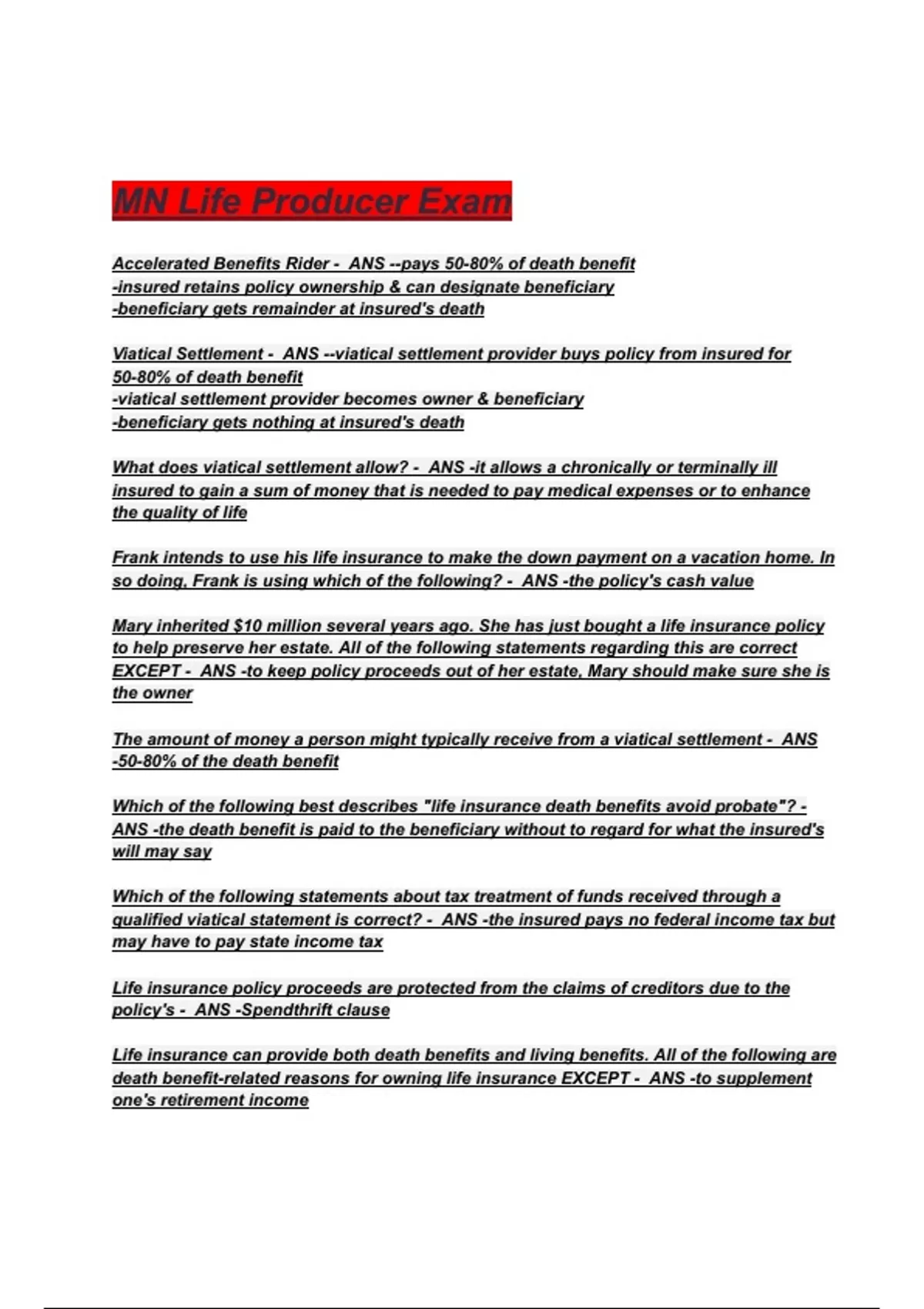 qualified viatical statement is correct? - ANS -the insured pays no federal income tax but