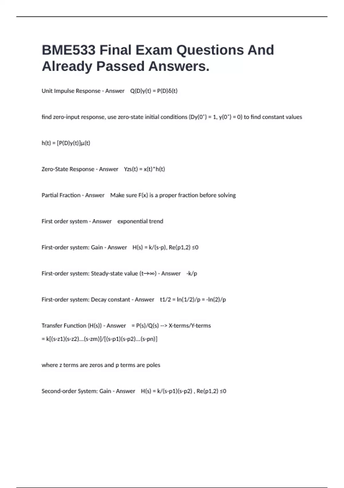 Unit Impulse Response - Answer Q(D)y(t) = P(D)δ(t) find zero-input response, use zero-state initial conditions (Dy(0⁺) = 1, y(0⁺) = 0) to find constant values h(t) = [P(D)yₙ(t)]µ(t) Zero-State Response - Answer Yzs(t) = x(t)*h(t) Partial Fraction - Answer Make sure F(x) is a proper fraction before solving First order system - Answer exponential trend First-order system: Gain - Answer H(s) = k/(s-p), Re(p1,2) ≤0 First-order system: Steady-state value (t→∞) - Answer -k/p First-order system: Decay constant - Answer t1/2 = ln(1/2)/p = -ln(2)/p Transfer Function (H(s)) - Answer = P(s)/Q(s) --> X-terms/Y-terms = k[(s-z1)(s-z2)...(s-zm)]/[(s-p1)(s-p2)...(s-pn)] where z terms are zeros and p terms are poles Second-order System: Gain - Answer H(s) = k/(s-p1)(s-p2) , Re(p1,2) ≤0
